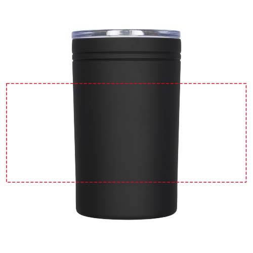 Doppelwandige Konstruktion, vakuumisoliert. Durchsichtiger Stülpdeckel mit Schiebeverschluss. Funktioniert als Becher oder Getränkeisolator. Fassungsvermögen 330 ml.
