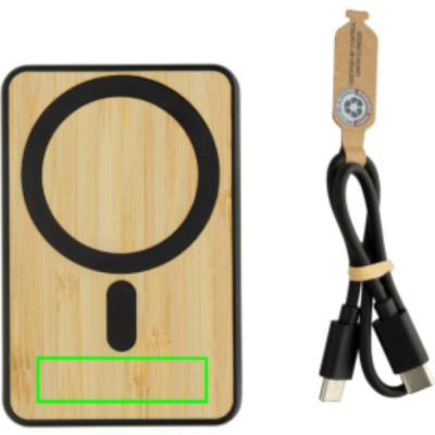 5.000mAh Powerbank im Taschenformat mit 5W magnetischem kabellosem Ladegerät aus RCS-zertifiziert recyceltem ABS-Kunststoff und FSC-zertifiziertem Bambus. RCS (Recycled Claim Standard) ist ein Standard zur Überprüfung des Recyclinganteils eines Produkts in der gesamten Lieferkette. Gesamtrecyclinganteil: 22% basierend auf dem Gesamtgewicht des Artikels. Die Powerbank enthält eine langlebige 5.000mAh A-Grade Lithium-Polymer-Batterie. Mit integriertem Telefonständer. Die Ladestandsanzeige zeigt den verbleibenden Energiestand an, sodass Sie immer wissen, wann Sie das Gerät wieder aufladen müssen. Type-C-Input: 5V/2,4 A; Type-C-Output: 5V/2,4A. Artikel und Zubehör PVC-frei. Mit RCS-zertifiziertem Ladekabel aus recyceltem TPE. Verpackt in FSC®-Mix-Verpackung.