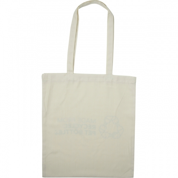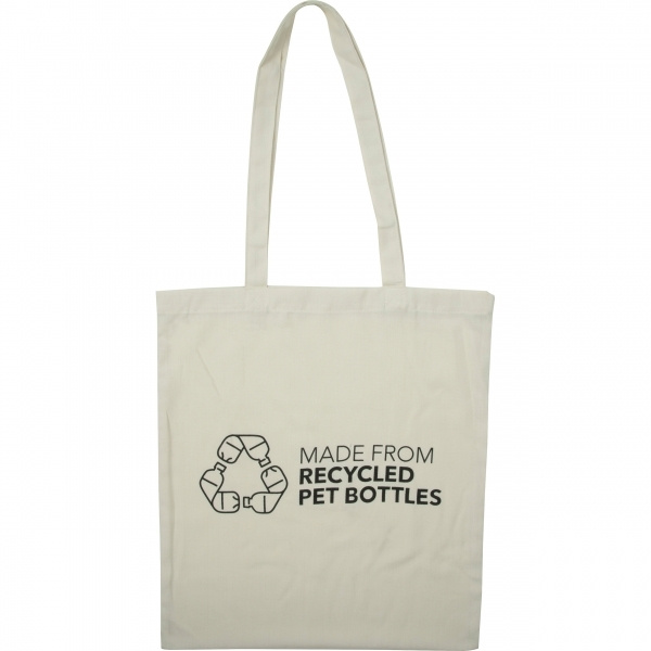 Reusable tote bag made from recycled RPET material, featuring a permanently printed `MADE FROM RECYCLED BOTTLES` logo on one side. The other side offers ample space for your custom branding. Eco-friendly, durable, and an ideal promotional item!