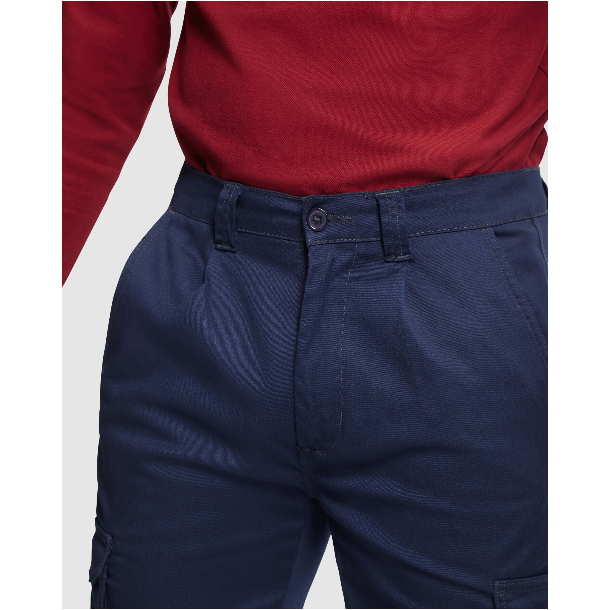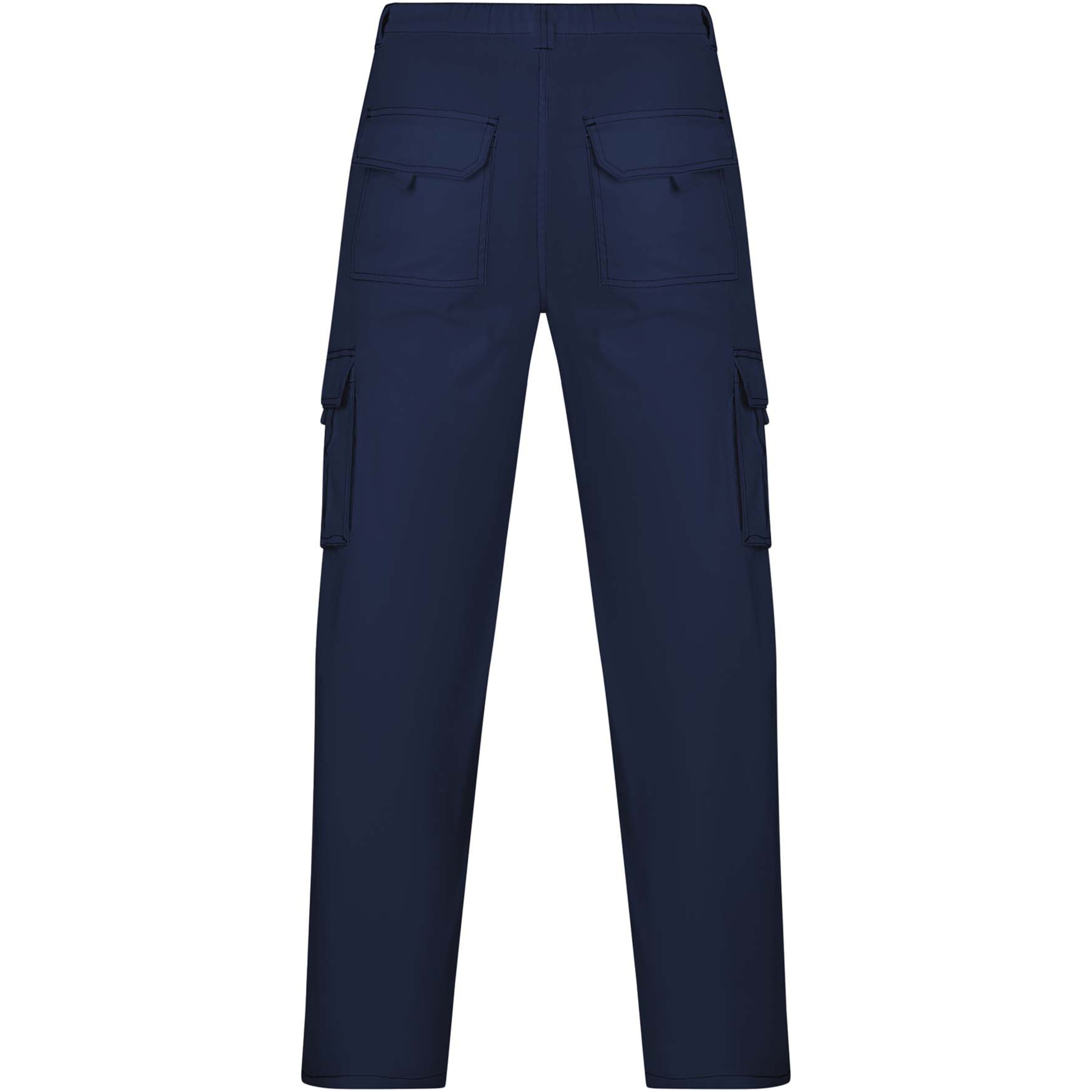 Long workwear trousers with elastane. Comfortable and adjustable fabric. Back adjustable elastic waist. Two front pockets. Two functional back pockets with flap and hook & loop fastening. Two functional side gusseted pockets with flap and hook & loop fastening. Contrasting seams.