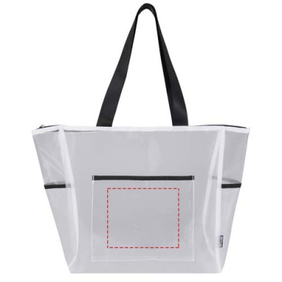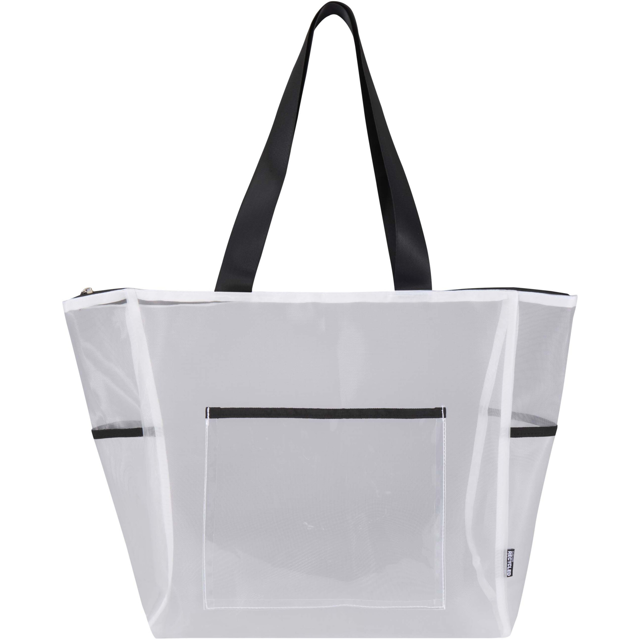 Crafted from recycled polyester mesh, this spacious 23-litre tote bag offers a more sustainable choice without compromising on practicality. It features a secure zipped main compartment, a front pocket and two side pockets to keep essentials organised, while the smooth carry handles (30 cm dropdown length) ensure comfortable use. The transparent mesh construction delivers a clean, contemporary look and allows easy visibility of contents – ideal for work, travel, gym sessions or events with clear-bag policies. Resistance up to 15 kg.