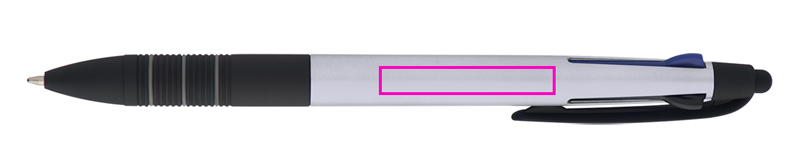 4in1 plastic ballpen with 3 different writing colors (blue, red and black) + touch function and rubberized grip zone. We print your logo on the shaft.