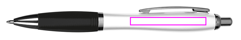 Ballpoint pen with white barrel, metal clip, blue writing large capacity refill and colored soft touch grip zone. We print your logo on the right side of the clip.