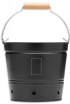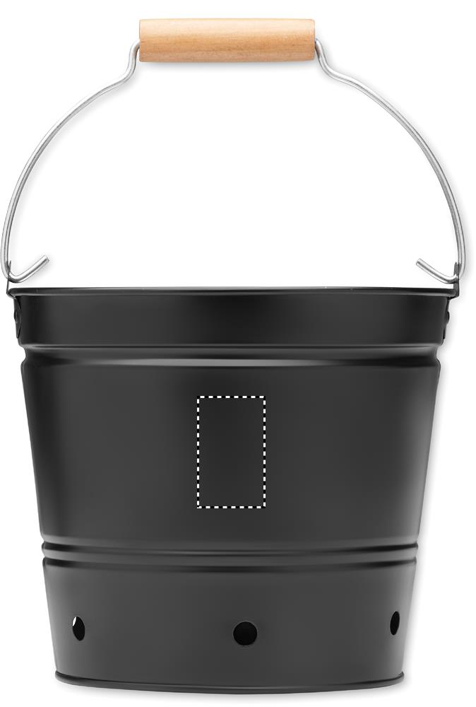 Iron portable bucket barbecue with stainless steel grill with wooden handle.
