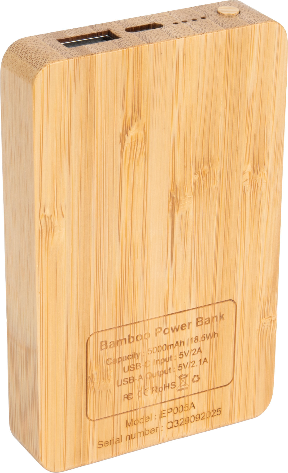 This 5000 mAh bamboo power bank blends natural aesthetics with modern functionality. The engraved logo illuminates when the device is activated, adding a stylish and distinctive visual touch. Four LED indicators display the current battery level, while the USB-C input/output (5V/2A) and the USB output (5V/2A) provide fast and reliable charging. A USB-C cable is included, making the power bank ready to use straight out of the box.