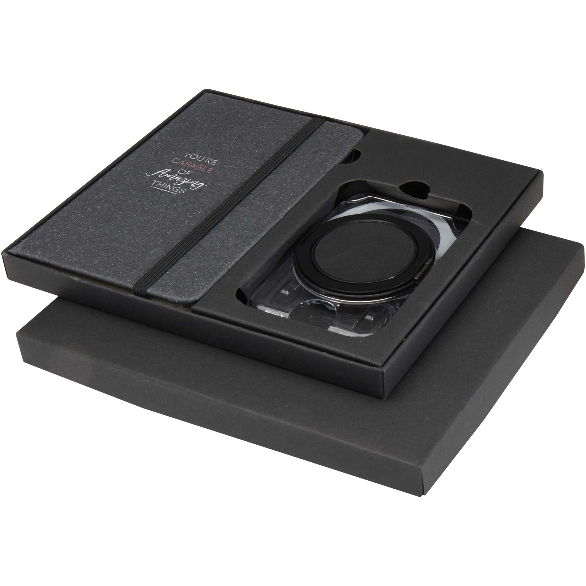 Praktiline kinkekomplekt, mis sisaldab A6-formaadis märkmikku ja MagSafe'i rahakotti. Märkmikul on tumehall taaskasutatud materjalist plastik kaaned, 80 kreemikat lehte 70 g/m² ja must elastne sulgur. Läbipaistev MagSafe'i rahakott mahutab ühe kaardi ja kinnitub magnetiliselt iPhone 12 või uuemate mudelite külge ning sellega on kaasas ka täiendav metallrõngas teiste telefonidega kasutamiseks. Mõlemad esemed on pakendatud elegantsesse musta papist kinkekarpi.