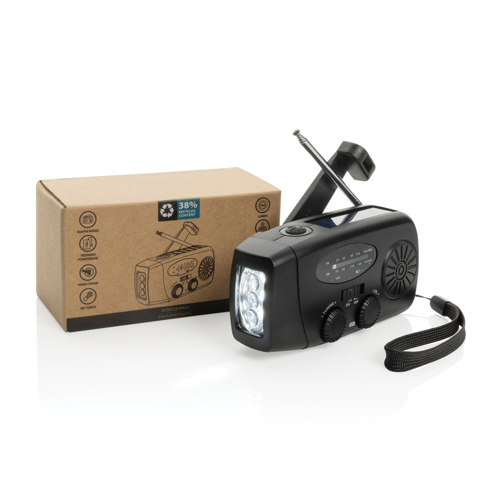 Ole valmis igaks olukorraks RescueWave'iga – mitmekülgse hädaabiraadioga, mis on loodud sind ühenduses hoidma ja varustama energiaga. Sellel kompaktsel seadmel on AM/FM-raadio, päikesepaneel, integreeritud 1W taskulamp, USB-väljund ja USB C-sisend, mis tagab, et oled ootamatuteks hetkedeks valmis. Sisseehitatud 1800mAh akuga saab RescueWave sinu telefoni laadida, pakkudes olulist energiat just siis, kui seda kõige rohkem vajad. Käsiväntmehhanism pakub usaldusväärset funktsionaalsust – vaid 1-minutiline väntamine toetab 5 minutit raadio kuulamist või 30 minutit taskulampi, muutes selle hädaolukordades oluliseks tööriistaks. Täislaetuna pakub raadio kuni 15 tundi raadiosaadet või 8 tundi taskulampi. Valmistatud RCS-sertifitseeritud taaskasutatud materjalidest, sealhulgas taaskasutatud ABS-plastist. RCS (Recycled Claim Standard) on standard toote taaskasutatud sisu kontrollimiseks kogu tarneahelas. Taaskasutatud sisu kokku: 38% toote kogukaalust. Toode ja tarvikud on PVC-vabad ja pakendatud FSC® pakendisse.