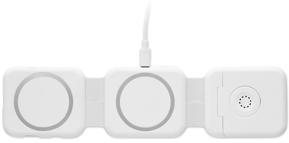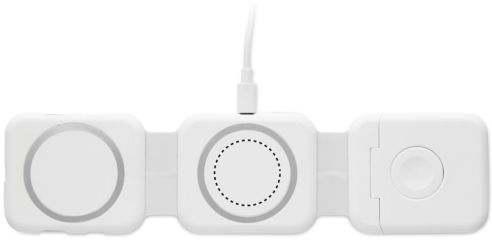 Magnetiline laadimisjaam ABS-plastist. 3 juhtmevaba laadimiskohaga. 1 x 15 W, 1 x 5 W TWS-i jaoks ja 1 Apple Watchi laadija (3 W). 2 Type-C ja 2 USB-A jaoturit. Integreeritud kaabli sisend: Type-C ja USB-A ühenduspesa.