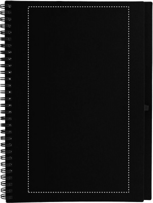 Taaskasutatud paberist märkmik pastakaga. Kahejuhtmeline. 140 tavalist taaskasutatud paberilehte (70 lehte). Nupuga pastapliiats taaskasutatud karbis ja biolagunevas plastis. Sinine tint. Must elastne pliiatsihoidja.