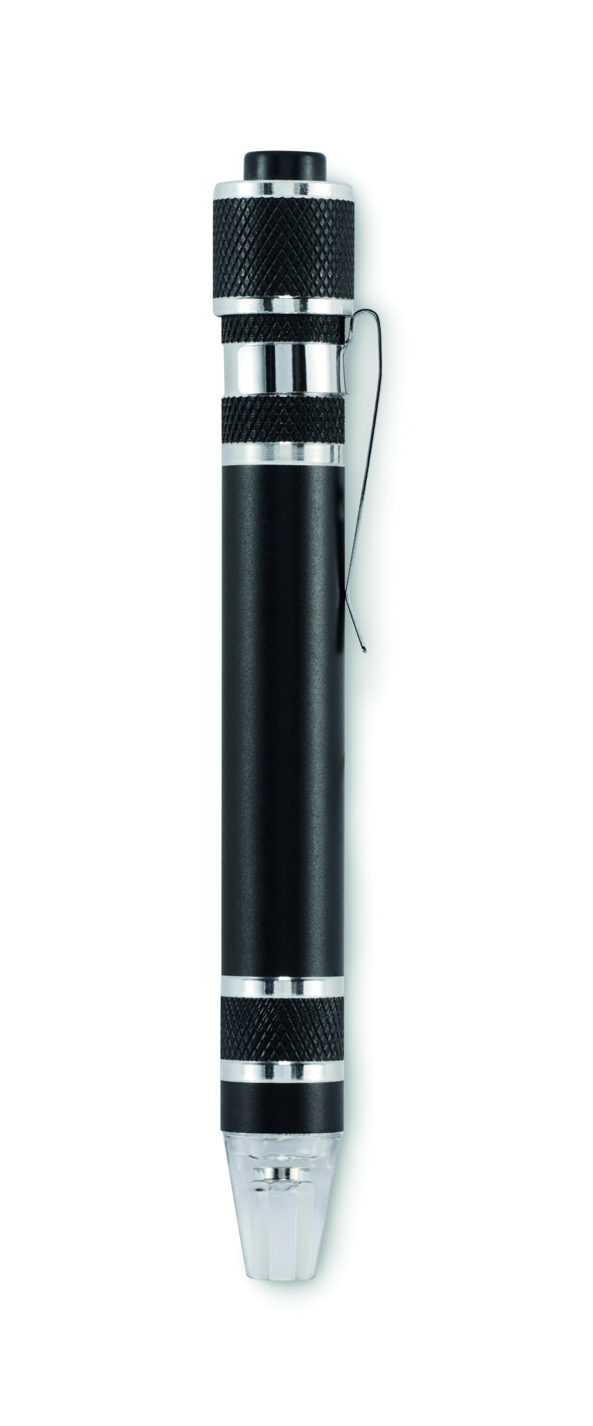 Pliiatsi kujuga taaskasutatud alumiiniumist multitööriist taskulambiga. Kaasas 3 lameotsaga ja 3 Phillipsi kruvikeeraja pead. Kaasas 4 nööppatareid LR41.