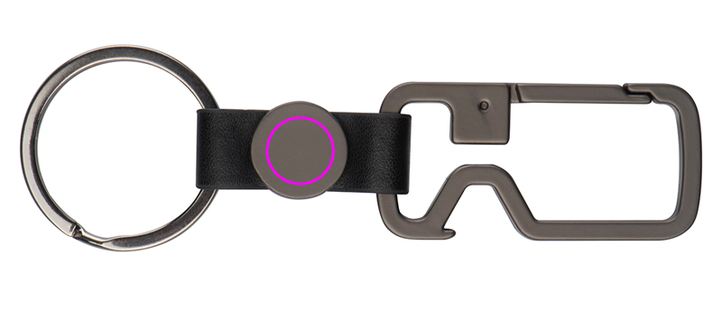 Grafiitinvärinen avaimenperä, jossa sulkurengas, avaimenperä ja pullonavaaja. Logosi kaiverretaan pyöreään kappaleeseen.