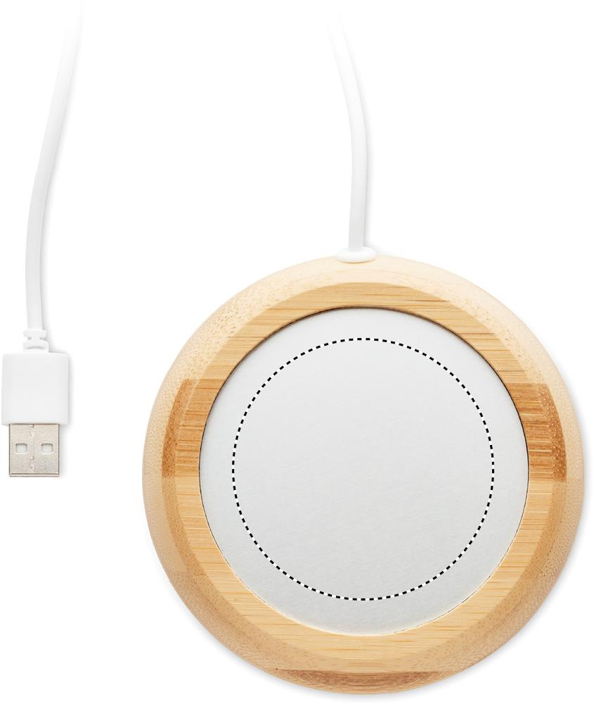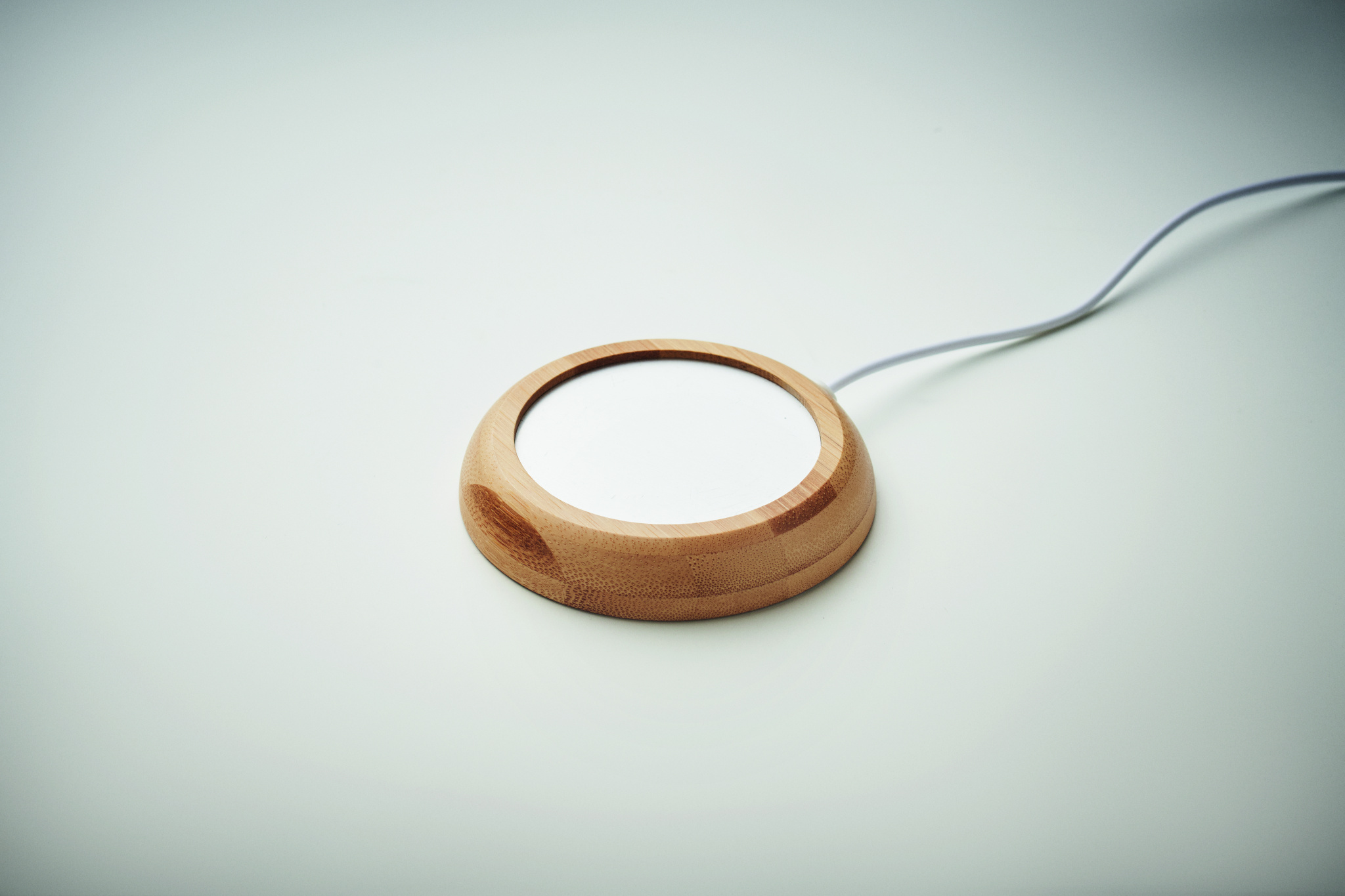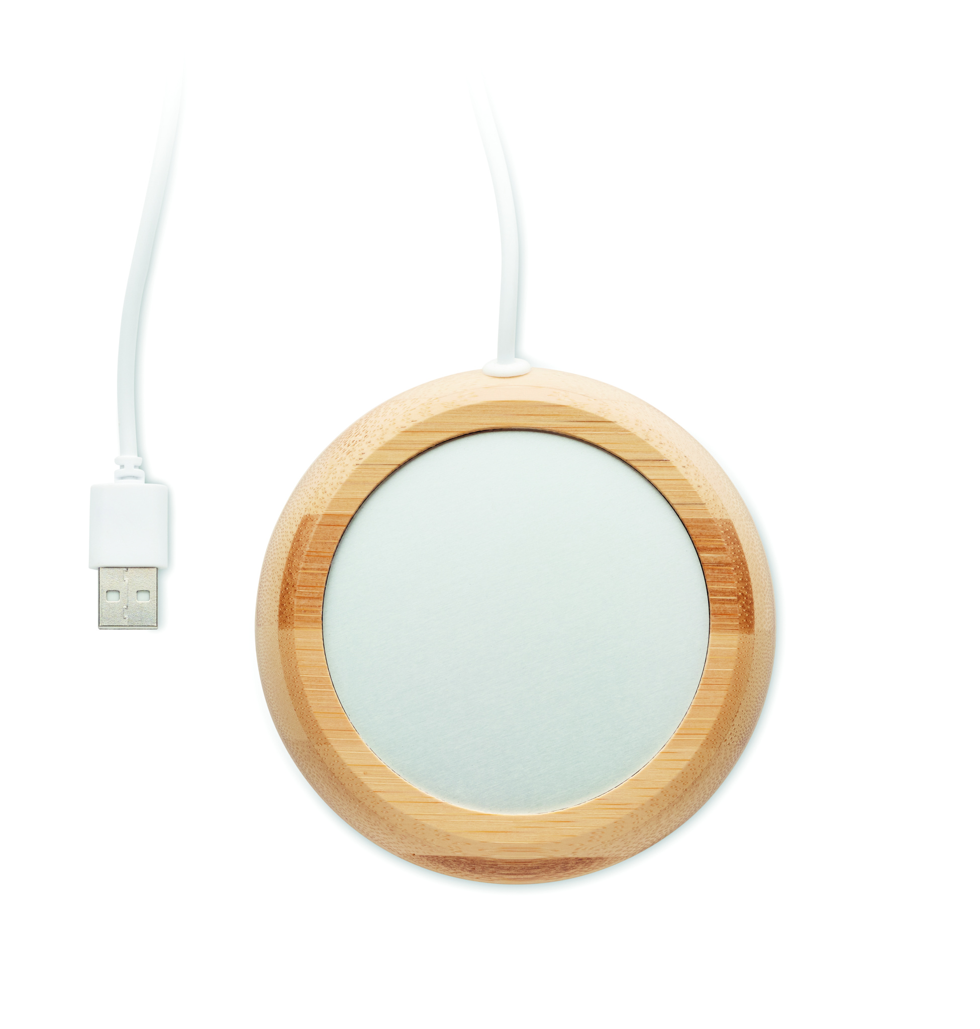 Bambusta valmistettu mukinlämmitin. Pitää juomat lämpiminä enintään 45ºC:een. Laitteessa on USB-liitäntäkaapeli.