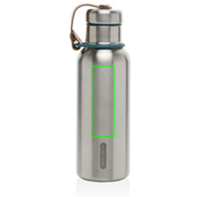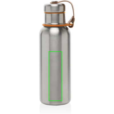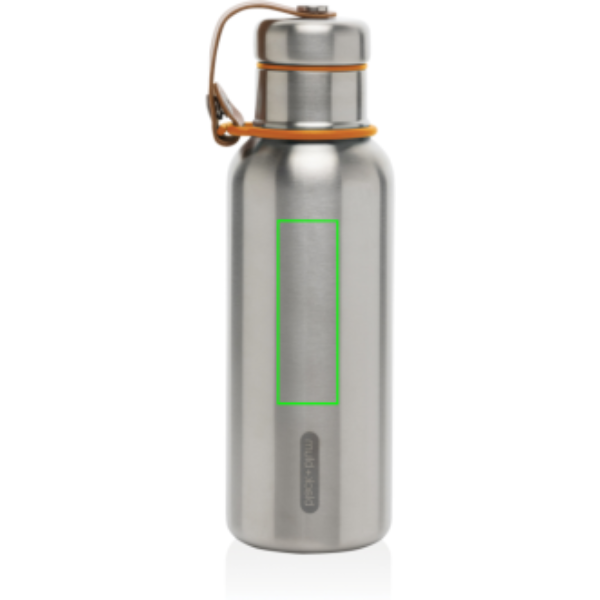 Ruostumattomasta teräksestä valmistettu vesipullo on tyylikäs tyhjiösuljettu pullo, joka pitää juomat kylmänä 24 tuntia tai kuumana 12 tuntia. Korkki on myös täysin ruostumatonta terästä, joten vesi ei pääse kosketuksiin muovin kanssa. Keinonahkainen kantolenkki toimii viehättävänä yksityiskohtana. Vain käsinpesu