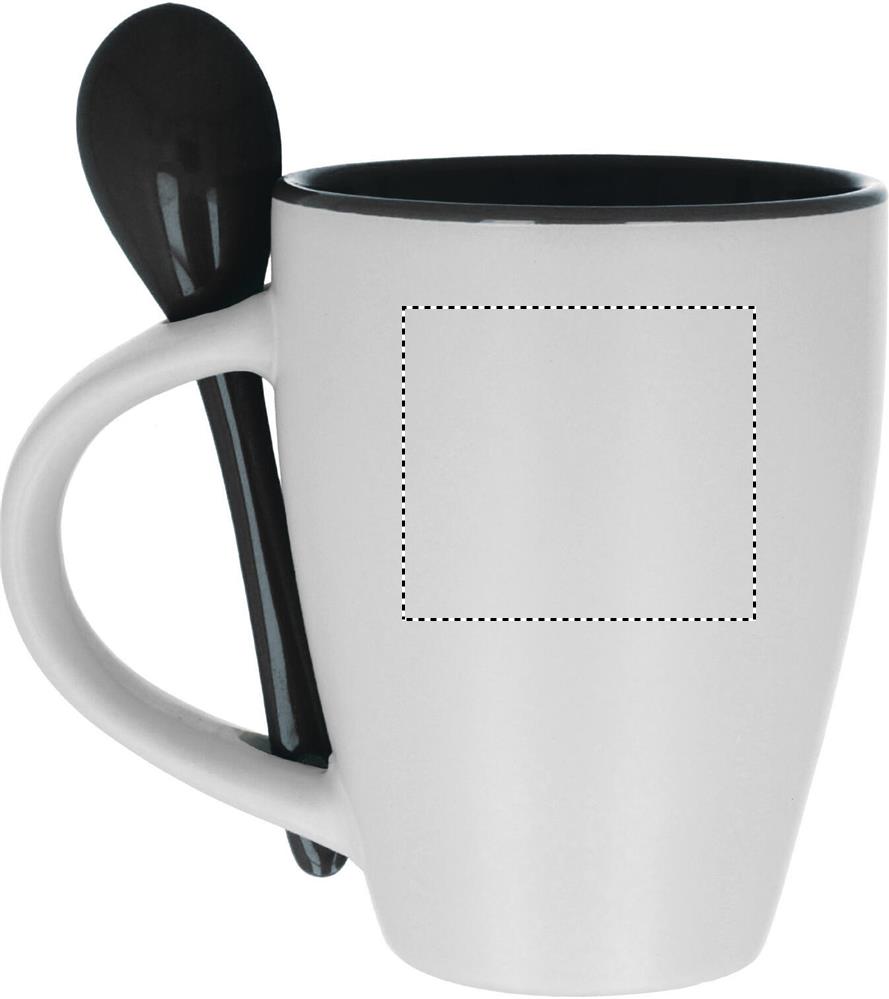 Kaksivärinen keraaminen kahvimuki 250 ml, sisältää lusikan. Tampopainatus kestää vain käsinpesun, keraaminen painatus on konepesun kestävä. Mikroaaltouunin kestävä, yksittäispakattuna 11,5x10,5x9,3cm laatikkoon.