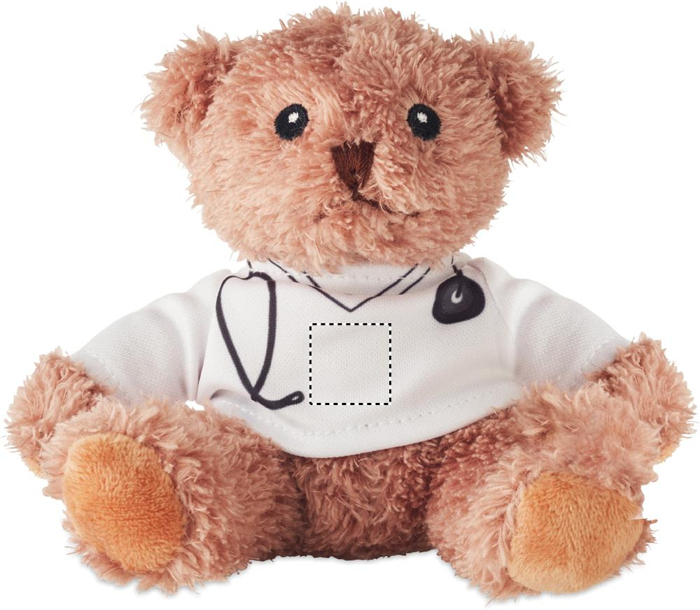Polyesteristä valmistettu pehmonallekarhu, joka on pukeutunut lääkäriksi ja jolla on valkoinen printti-t-paita. Brodeeratut silmät, nenä ja suu.