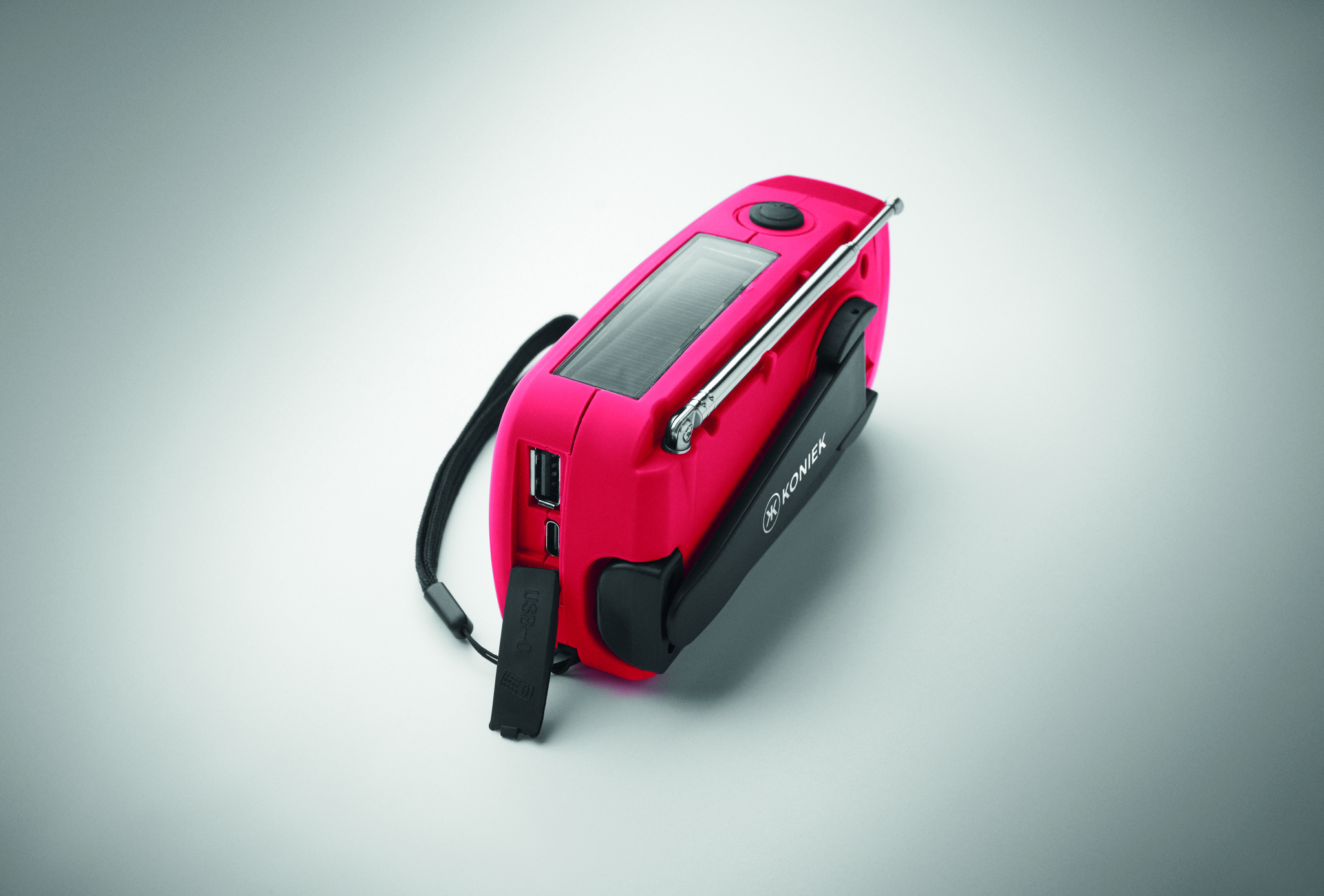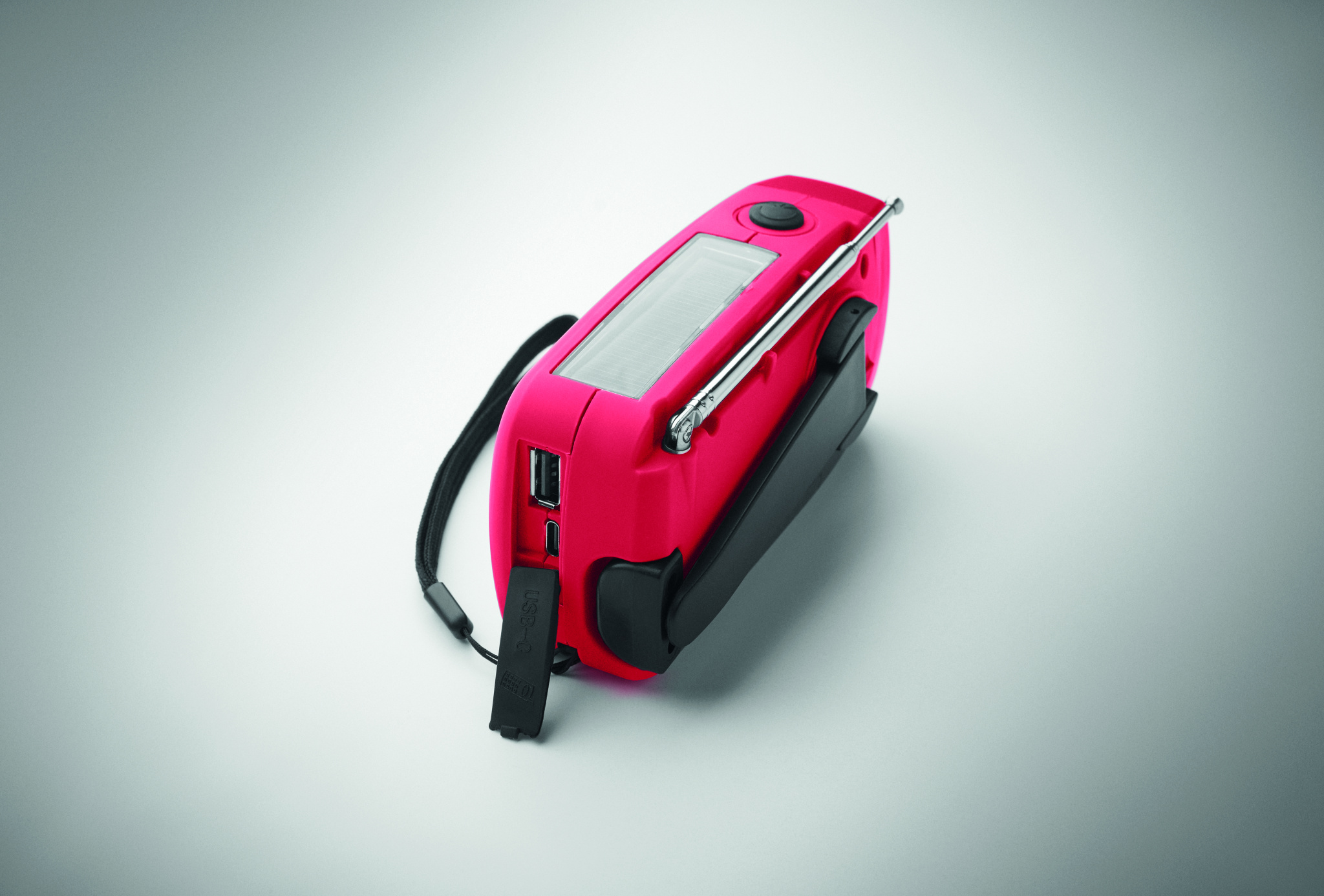 Kannettava AM/FM-radio ABS-muovista, LED-taskulampulla (2 asetusta) ja 1200 mAh:n varavirtalähteellä hätälatausta varten. Virtalähteenä aurinkokenno ja käsikamme.