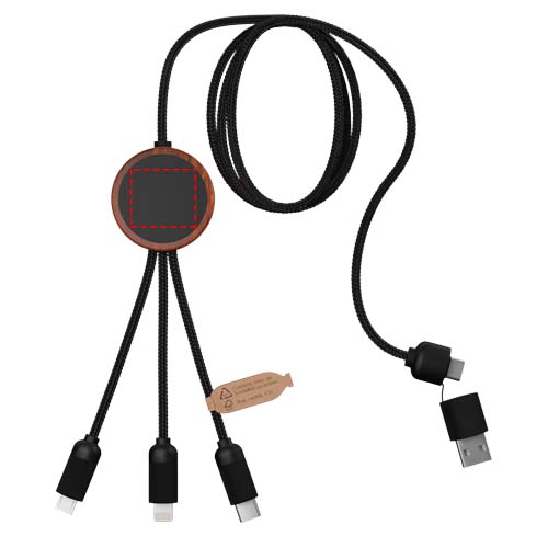 SCX.design C37 5-in-1 RPET-latauskaapeli pyöreällä puukotelolla, jossa valotehostettu logo