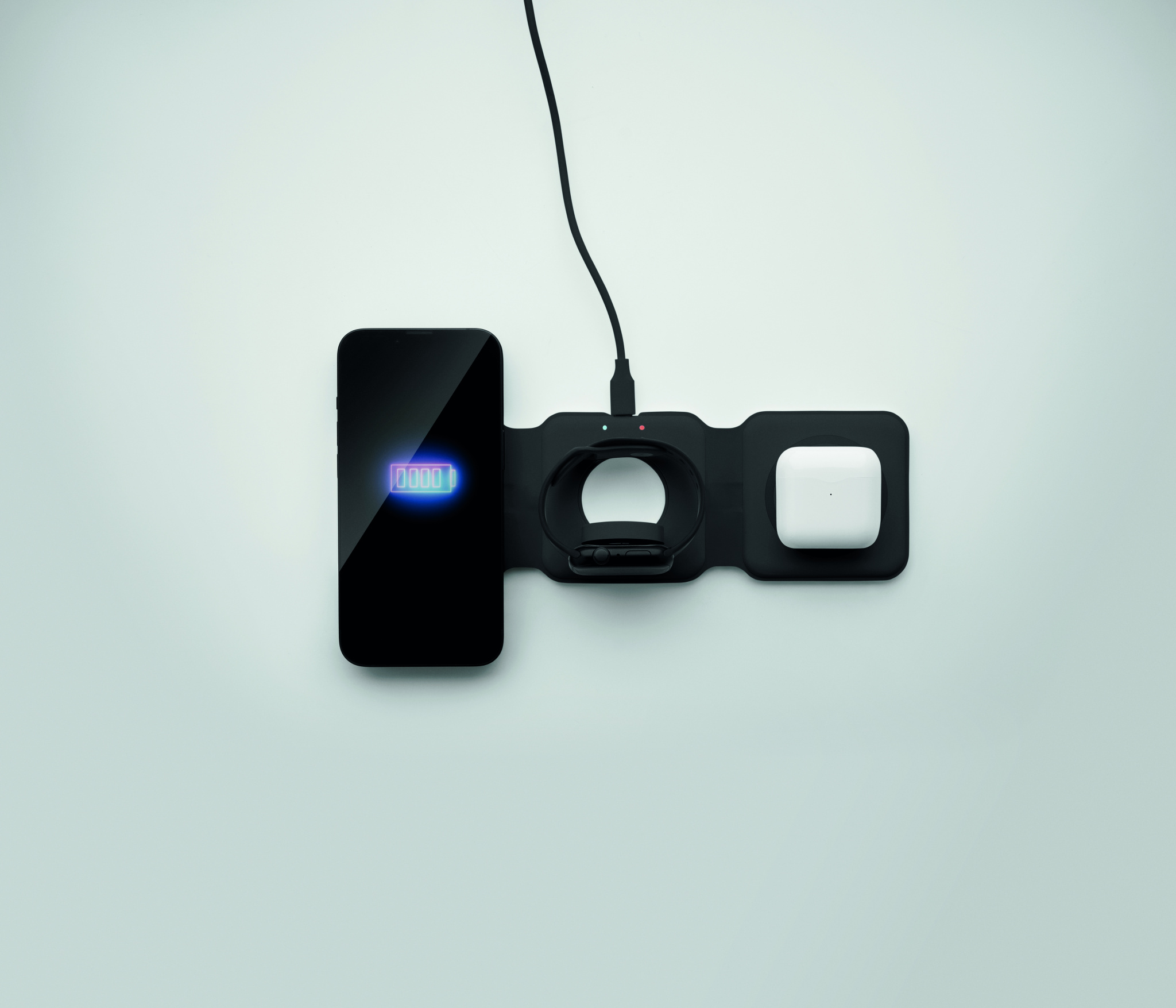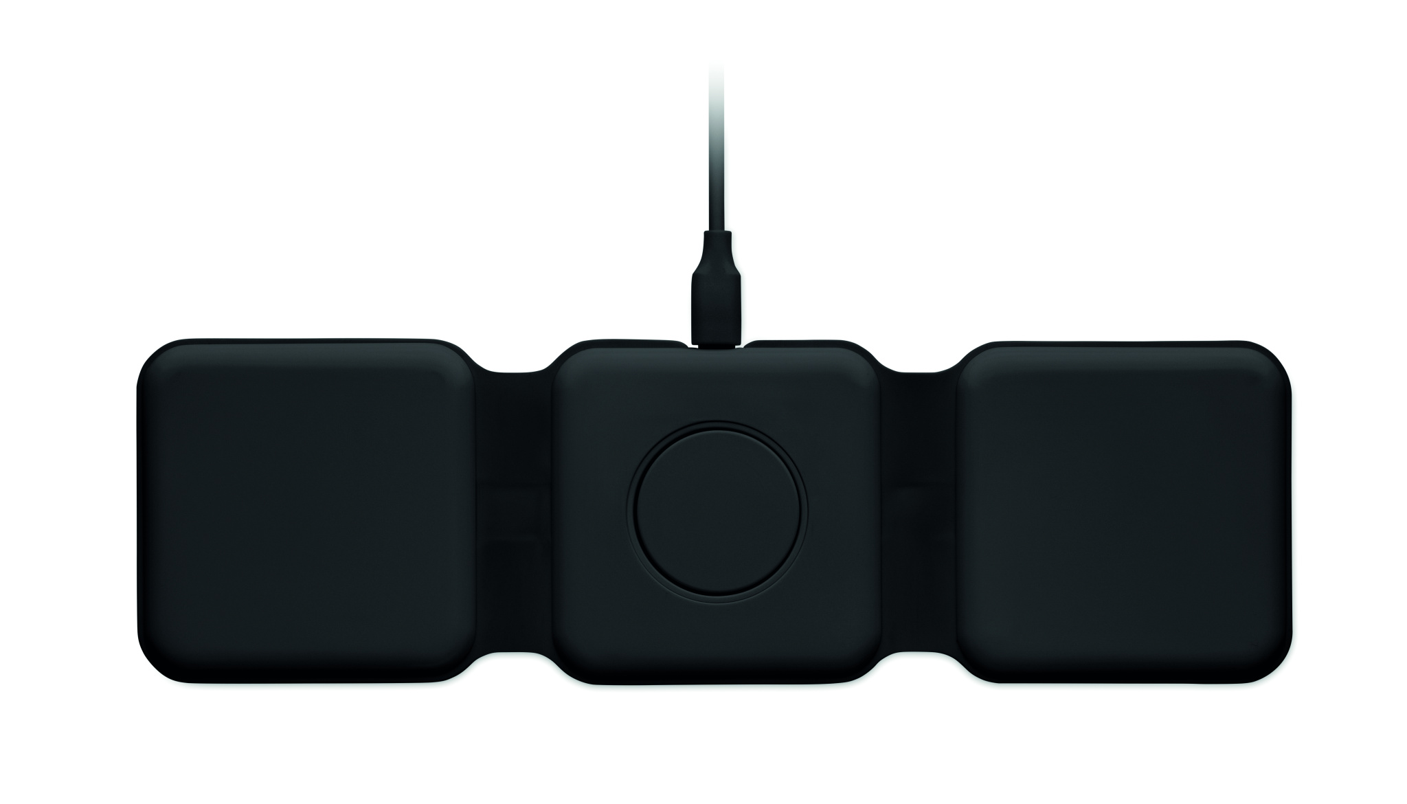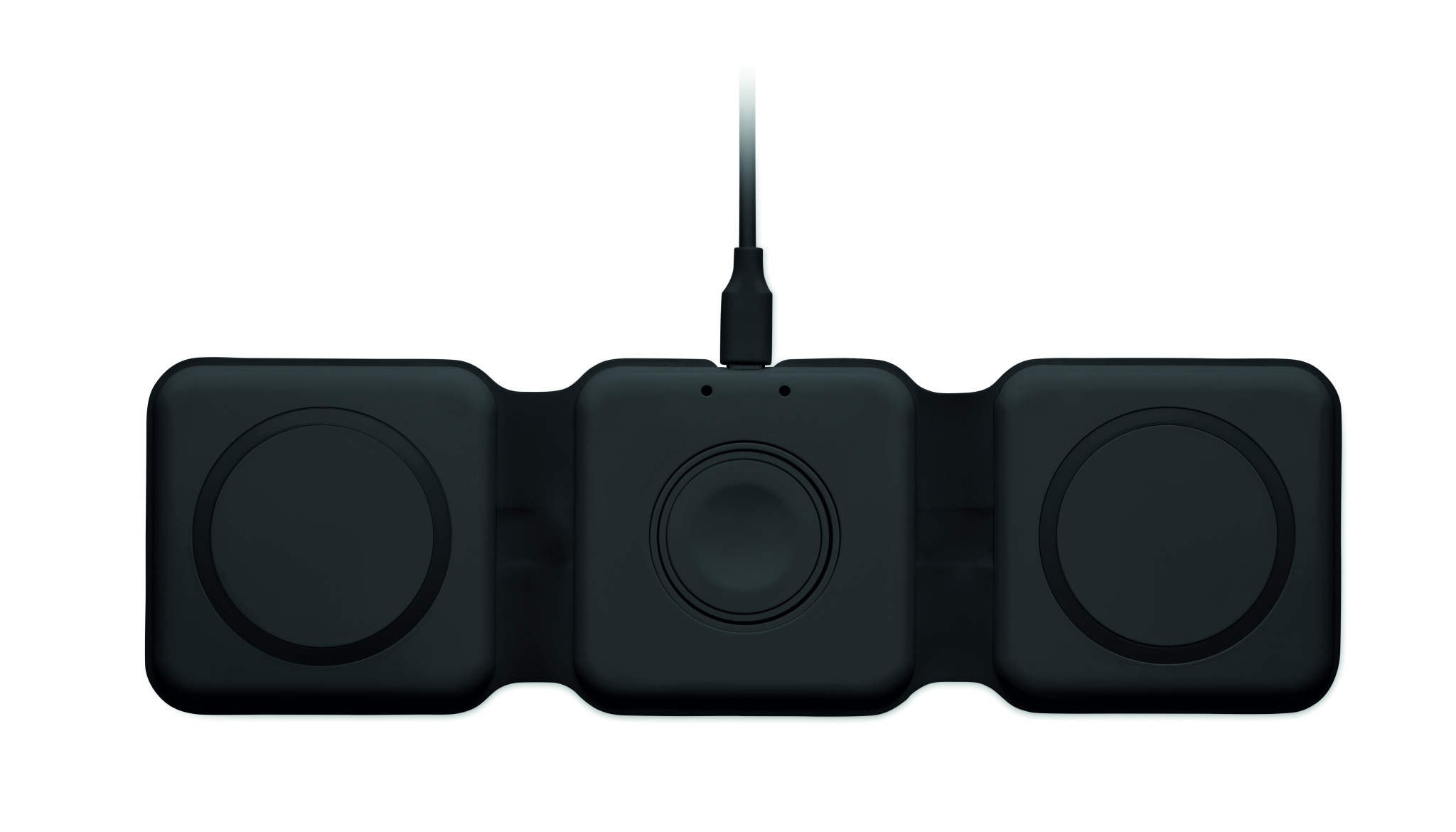 3 in 1 kokoontaitettava latausasema ABS-materiaalista. 3 langatonta latauspaikkaa. Tulo: 2-in-1 Type-C ja Type-A. Yhteensopiva QI-toiminnolla varustettujen laitteiden kanssa ( Androidien, iPhone® 8, X sekä iWatchin kanssa)
