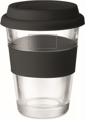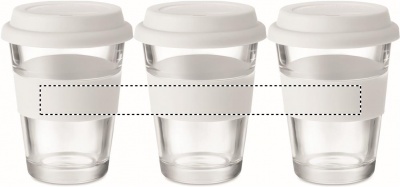 Lasinen 350 ml takeaway muki, silikonisella kannella ja gripillä. Tuote voi kuumentua ulkoisesti käytössä.