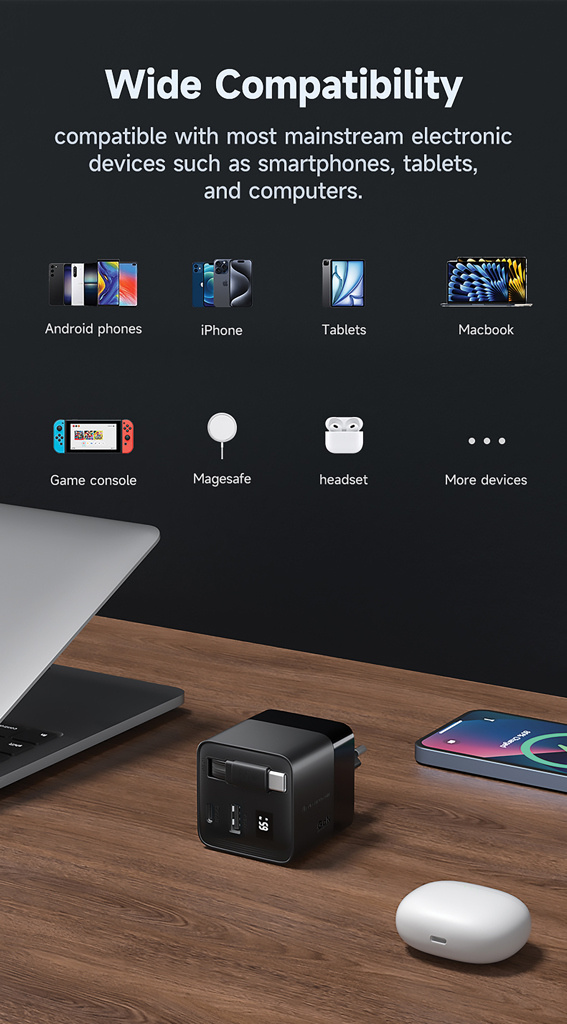 Tutustu älykkäimpään 65 W:n laturiin, jonka kaapeli on aina käytettävissäsi. Mendocino on 65 W:n PD GaN-laturi, jossa on sisäänrakennettu 80 cm:n pituinen sisäänvedettävä USB-C-kaapeli, joten voit ladata laitteitasi ilman erillistä kaapelia. Mukana toimitetaan myös vaihdettavat EU- ja UK-pistokkeet, mikä tekee siitä täydellisen matkakumppanin. GaN on uuden sukupolven lataustekniikka, joka mahdollistaa kompaktimman koon, vähemmän lämmönkehitystä ja paremman energiatehokkuuden. Mendocino lataa kaikki laitteesi täyteen nopeudella, mukaan lukien kannettavat tietokoneet, tabletit ja puhelimet – ja se voi ladata jopa kolme laitetta samanaikaisesti lisä-USB-C-porttien ja USB-A-ulostulon ansiosta. Mendocino on valmistettu RCS (Recycled Claim Standard) -sertifioidusta kierrätetystä palamattomasta PC-muovista. Kierrätysaste: 18 % tuotteen kokonaispainosta. Urban Vitamin -tuotteet on valmistettu ilman PVC:tä ja pakattu muovipäästöjä vähentävään pakkaukseen.