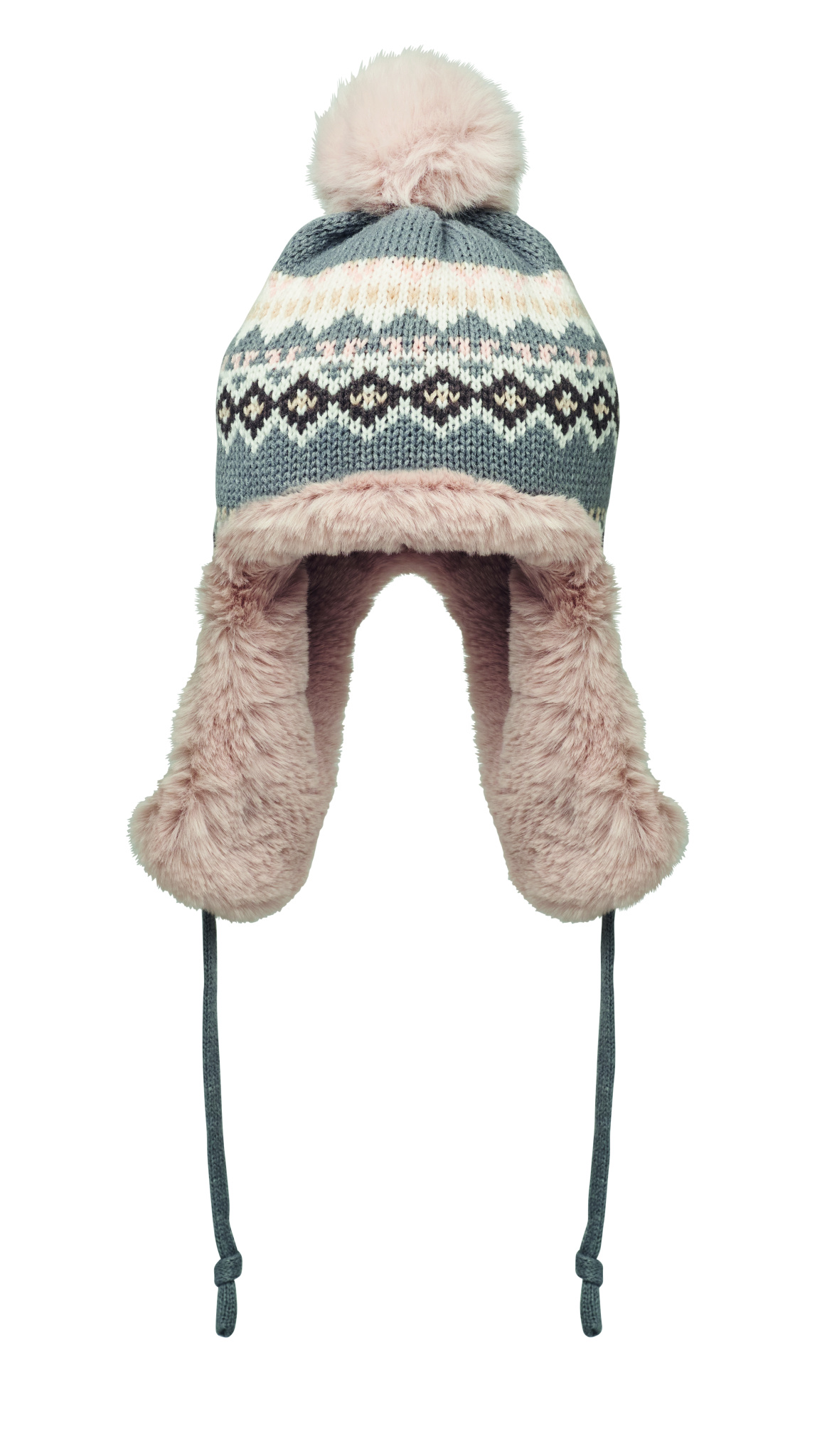 Megzta kepurė su ausų atvartais ir bumbulu iš akrilo pluošto, su poliesterio ir vilnos pamušalu. Vienoje pusėje yra etiketė spausdinimo vietai. Suaugusiųjų dydis.