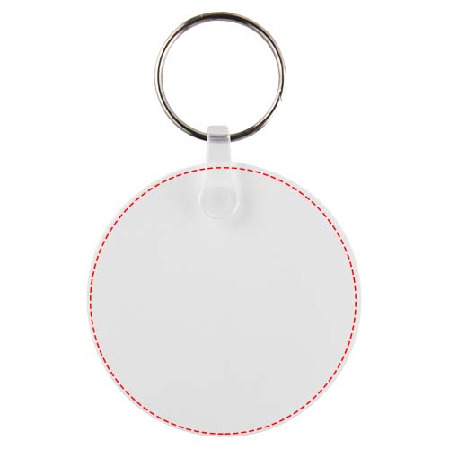 Baltas apskritimo formos raktų pakabukas su metaliniu padalintu raktų pakabuku. Metalinis žiedas turi plokščią profilį, kuris idealiai tinka siuntimui.