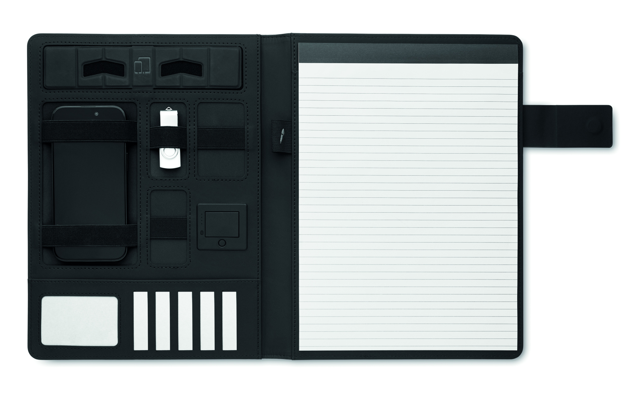 A4 konferenču mape ar lina-PU vāku. 5000 mAh jaudas banka un 15 W magnētiskais bezvadu lādētājs. 20 rindu lokšņu piezīmju grāmatiņa. Vairāki iekšējie nodalījumi. Magnētiska aizdare. Elastīgs pildspalvu turētājs.