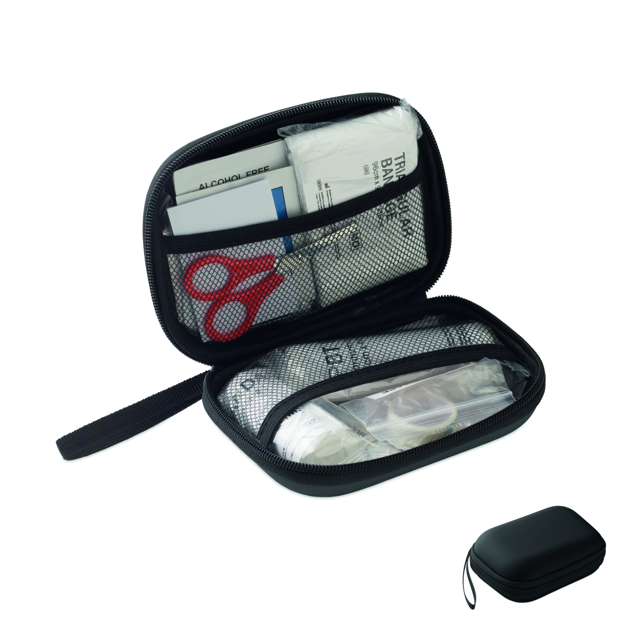 Pirmās palīdzības aptieciņa cietā PU maciņā. Komplektā ietilpst 2 cimdi, 1 sega, 1 lente, 2 pārsēji, 1 šķēres, 4 vates tamponi, 10 plāksteri un 6 tīrīšanas salvetes. Nav pieejams pārdošanai ārpus ES.
