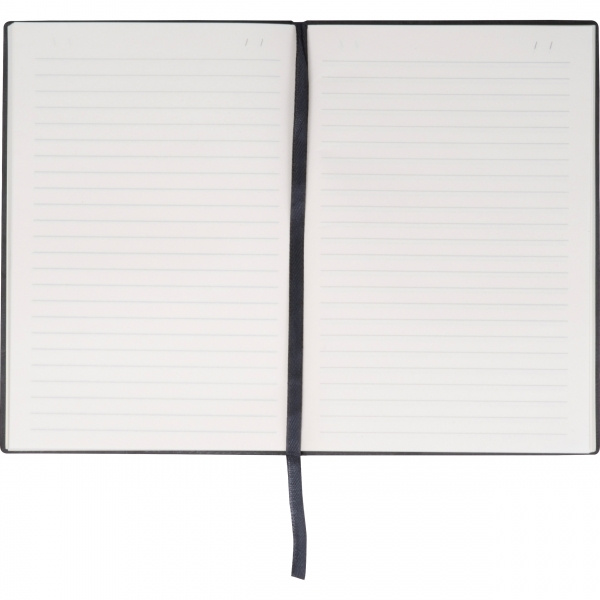 Блокнот формата А5 с мягкой мягкой обложкой из полиуретана, закладкой и 192 страницами в линейку из переработанной бумаги. Ваш логотип напечатан на обложке под плетёной областью.
