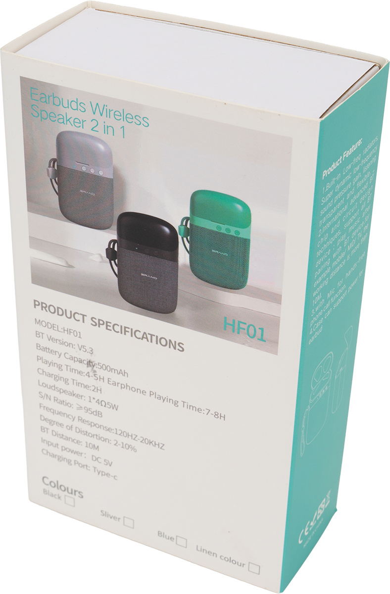 Модель HF01 — это инновационное сочетание портативной колонки и беспроводных наушников в одном устройстве — идеальное решение для тех, кто ценит удобство и практичность. Благодаря Bluetooth 5.3, наушники обеспечивают стабильное и быстрое соединение без помех, а аккумулятор ёмкостью 500 мА·ч обеспечивает 4–5 часов работы колонки или 7–8 часов работы наушников после примерно 2 часов зарядки через порт USB Type-C. Встроенный динамик 1 × 4 Ом мощностью 5 Вт обеспечивает чистый и динамичный звук, а соотношение сигнал/шум ≥ 95 дБ гарантирует чёткое звучание без помех. Частотная характеристика 120 Гц – 20 кГц и уровень искажений 2–10% гарантируют комфортное прослушивание музыки различных жанров. Устройство имеет радиус действия до 10 метров, питается от постоянного тока 5 В и доступно в трёх стильных цветах: чёрном, серебристом и синем.