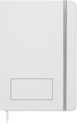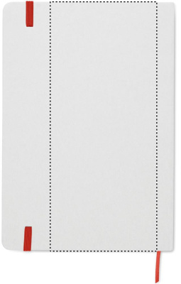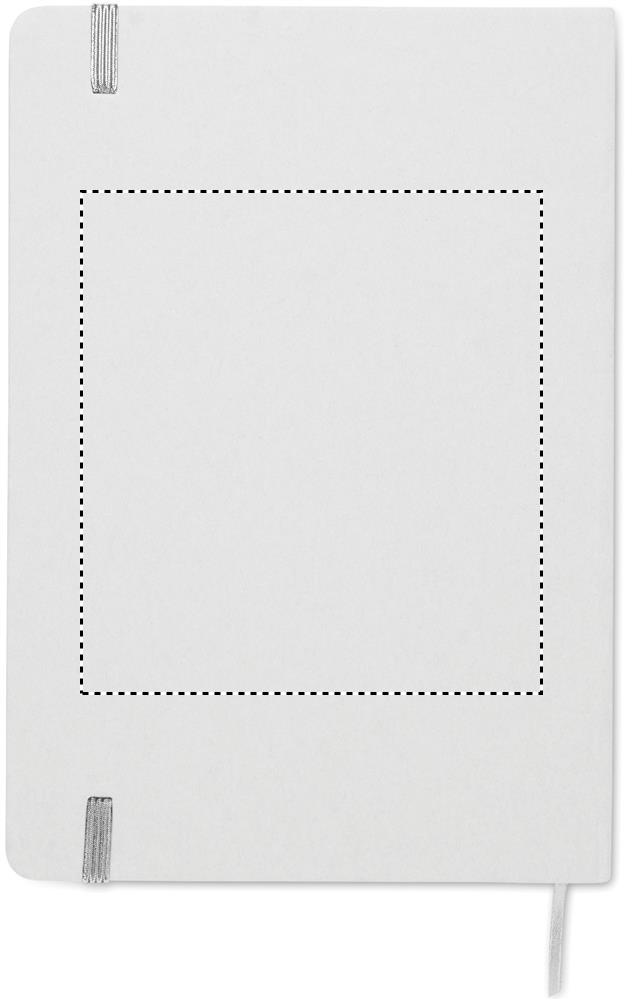 A5 notebook with hard recycled carton cover. White cover. Casebound. 160 lined recycled paper pages (80 sheets). Elastic closure strap, ribbon bookmark matching with revealed colour. After laser engraving the colour is revealed.