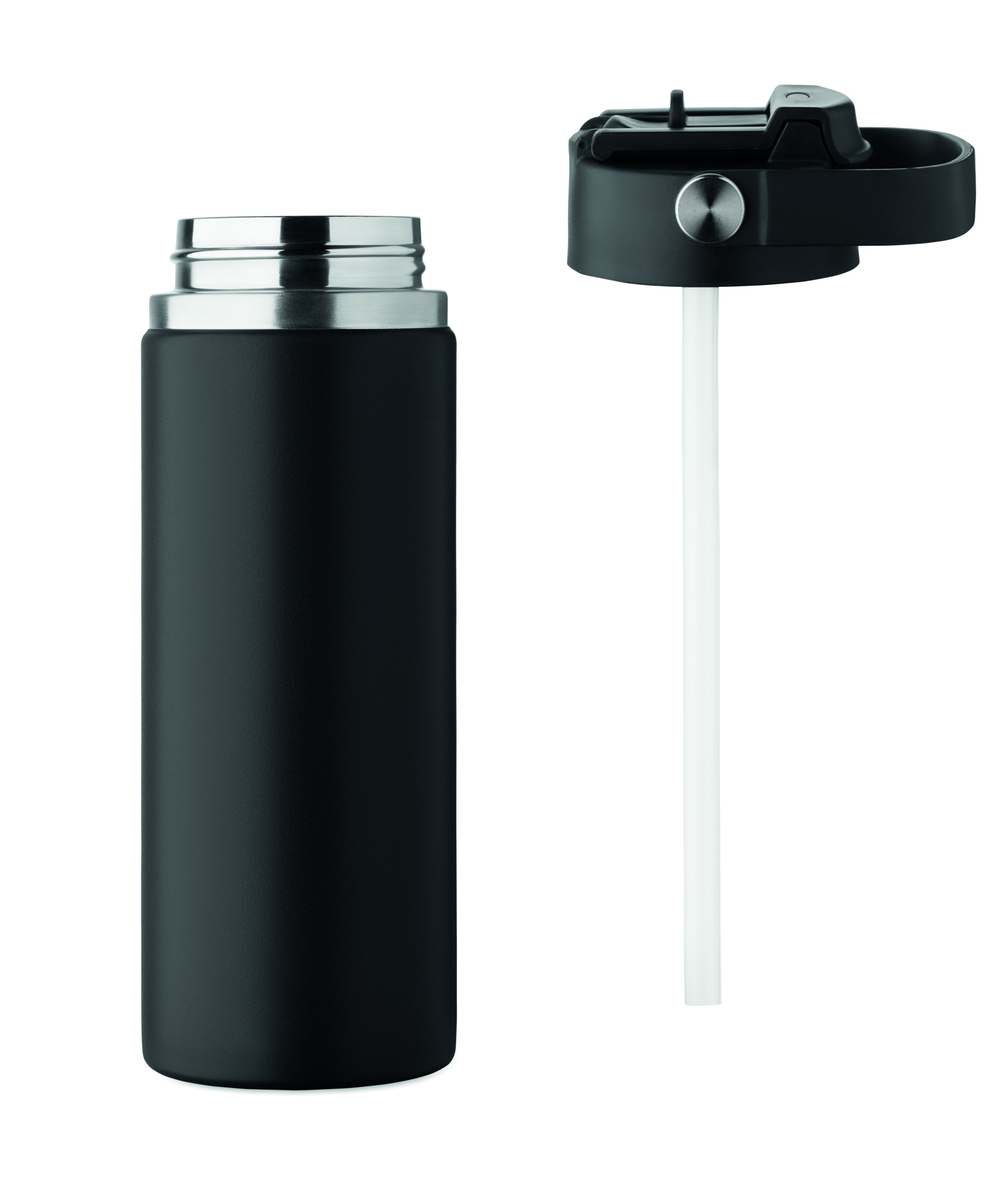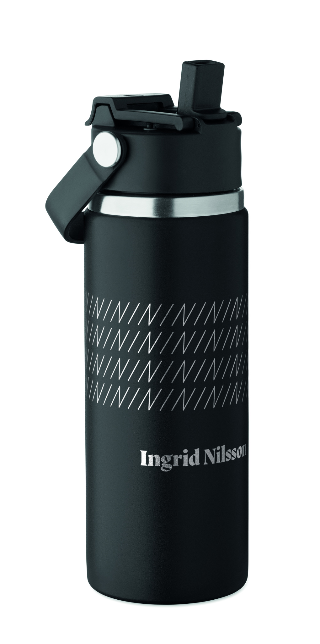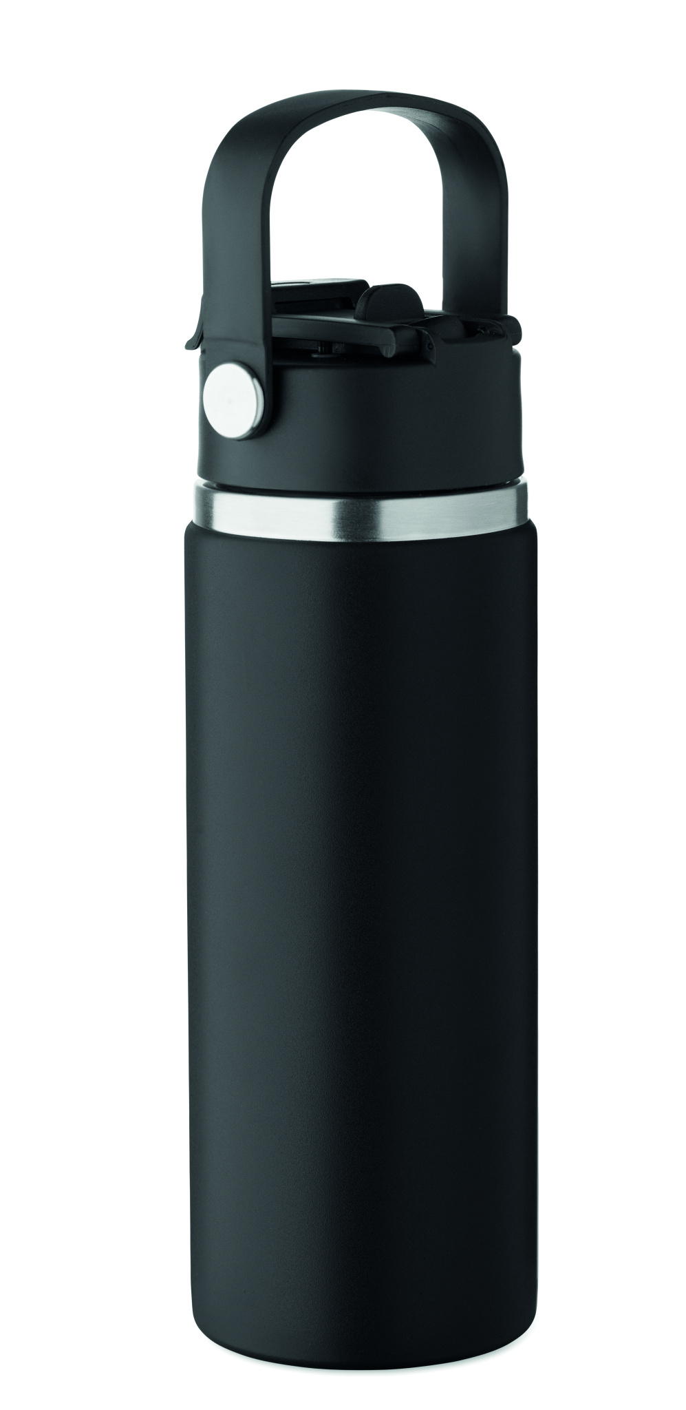 Double wall insulated bottle in recycled stainless steel (90% recycled stainless and 10% stainless steel) with combination straw and sip lid with handle. Leak free. Capacity : 500 ml.