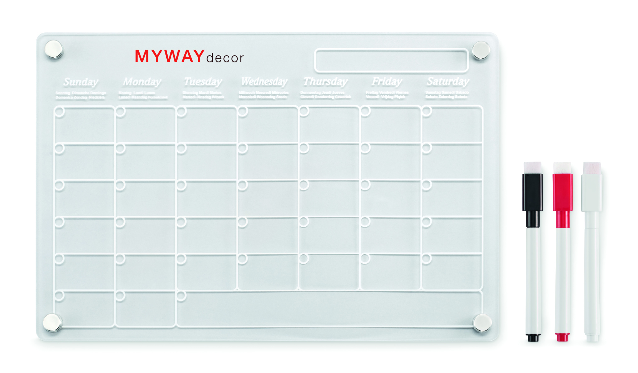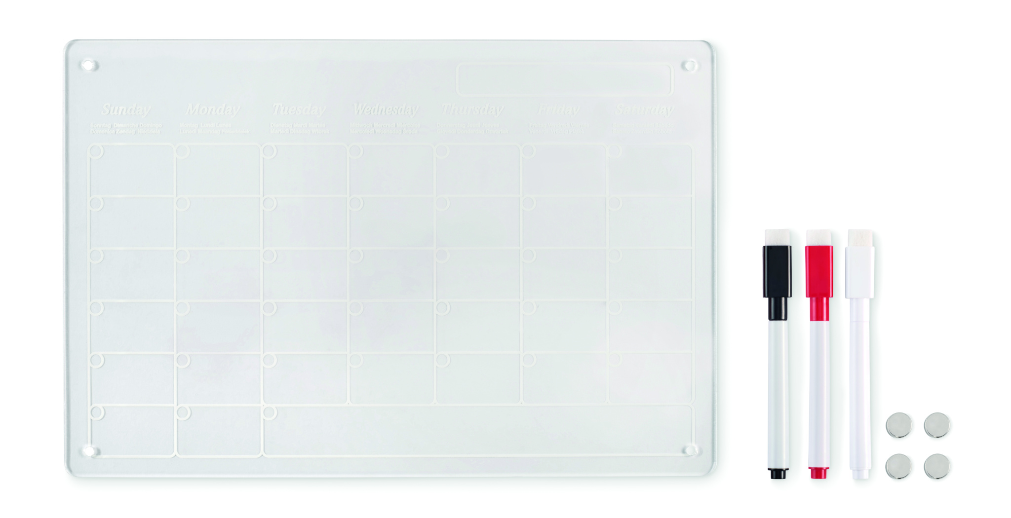 Magnetic acrylic monthly planner in A4 size with 3 erasable magnetic markers (black, red and white). Includes screws for mounting.
