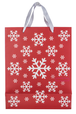 Рождественский подарочный пакет из бумаги с рисунком снежинок и двумя ручками. Мы напечатаем ваш логотип на этикетке.