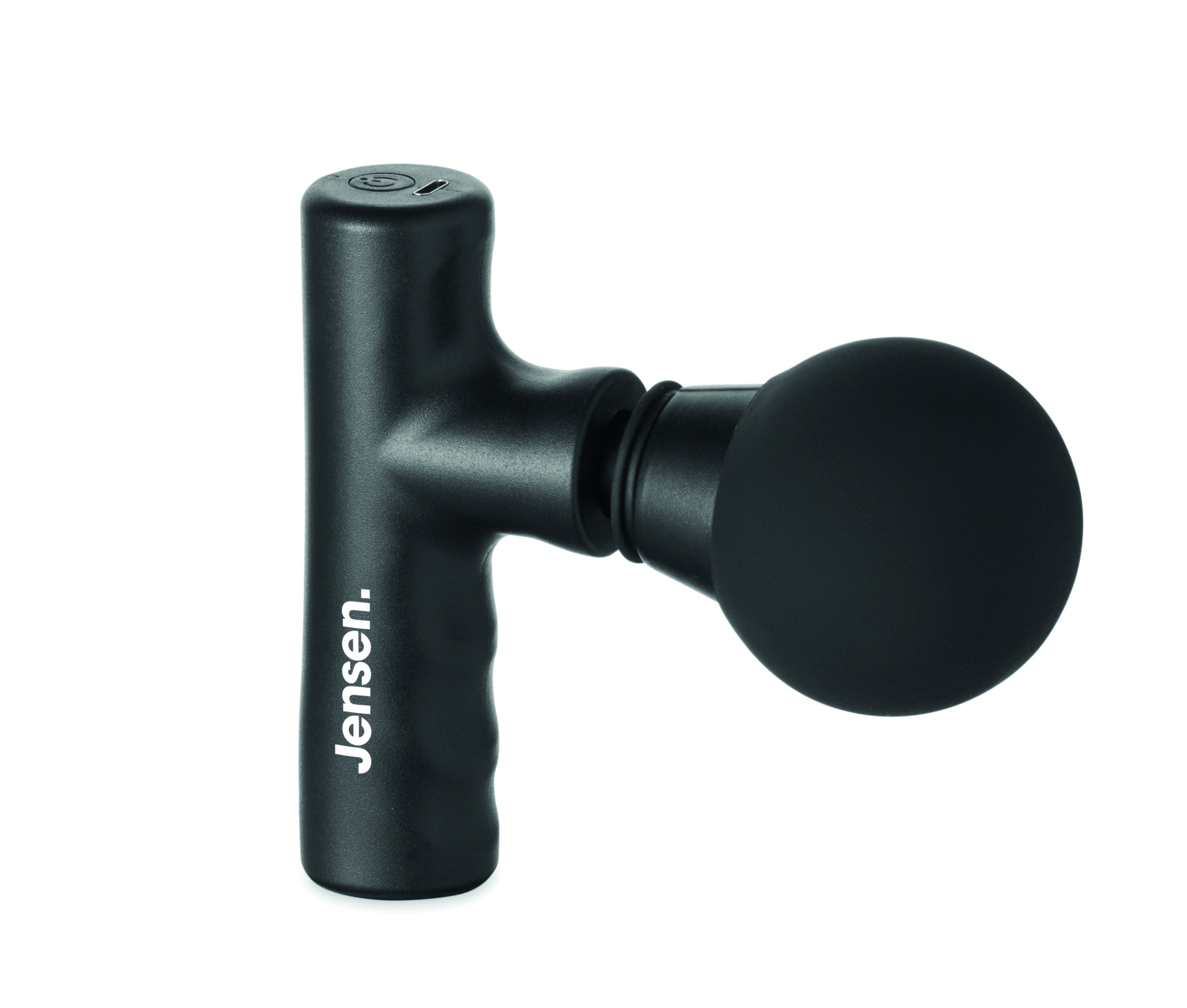 Massage gun with 2 speed level in ABS. Rechargeable 1200mAh battery. Comes with an RPET pouch.