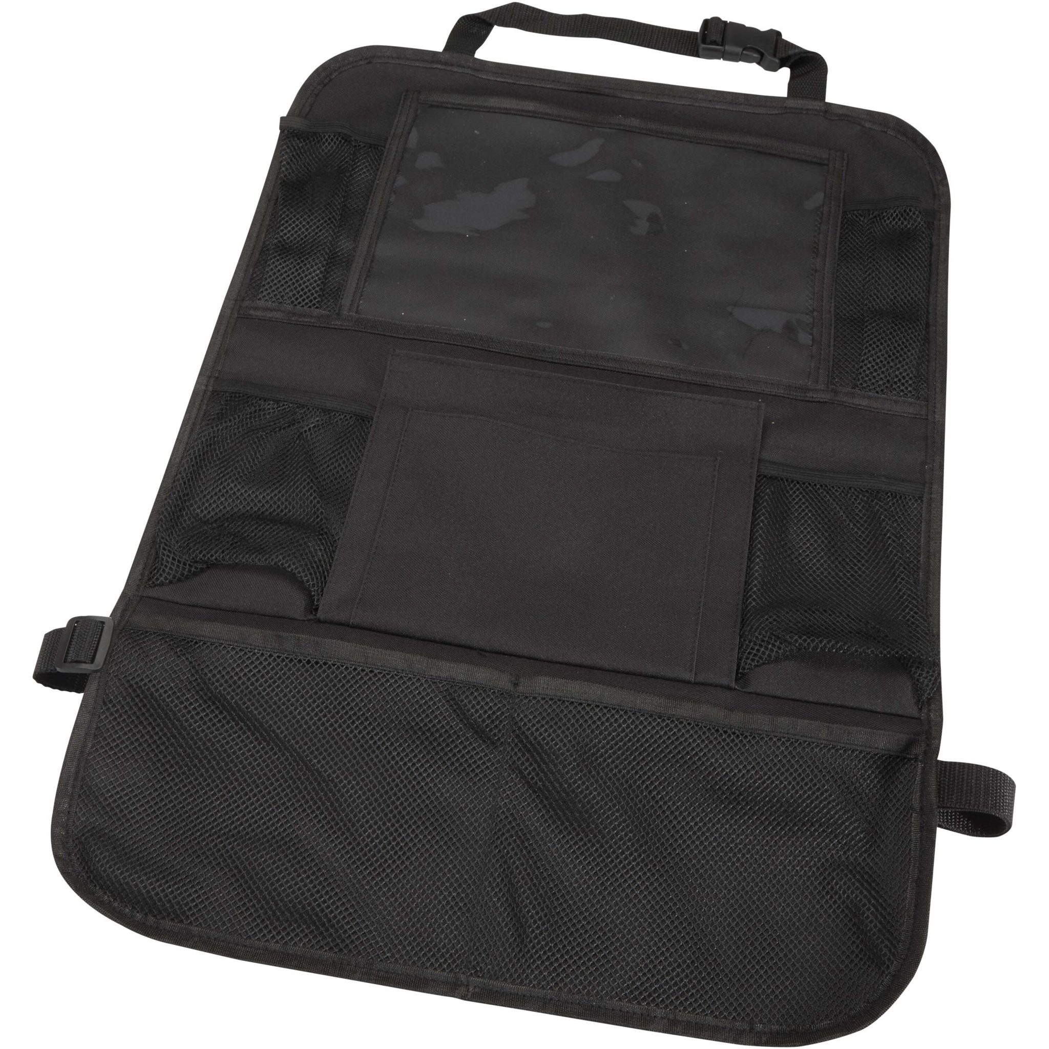 Органайзер на заднее сиденье автомобиля с несколькими сетчатыми карманами для хранения предметов первой необходимости, таких как закуски, игрушки или бутылки, а также окошком из ПВХ для планшета. Он легко крепится к переднему сиденью и помогает поддерживать порядок в автомобиле — идеально подходит для семей, путешествий на автомобиле или повседневного использования.