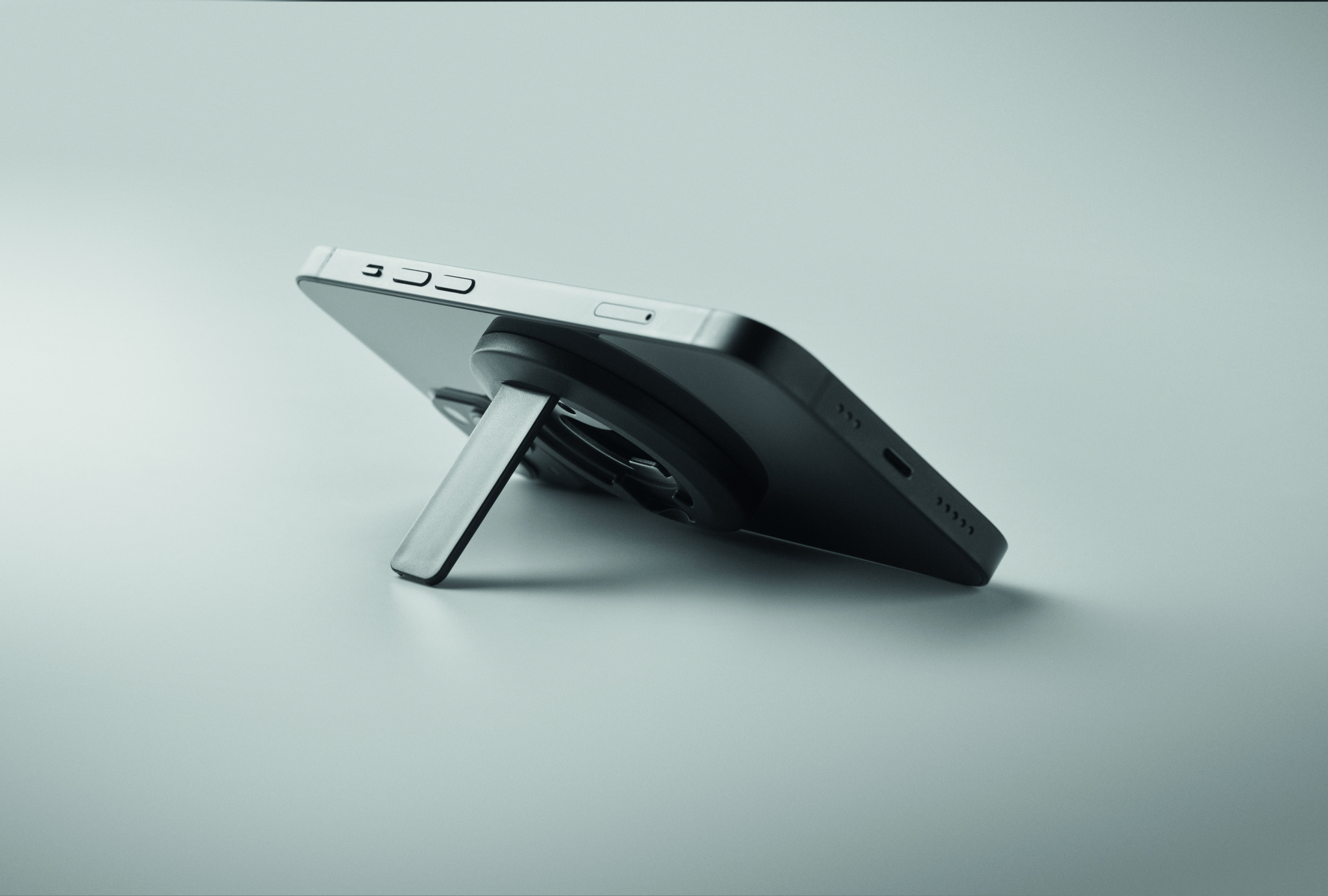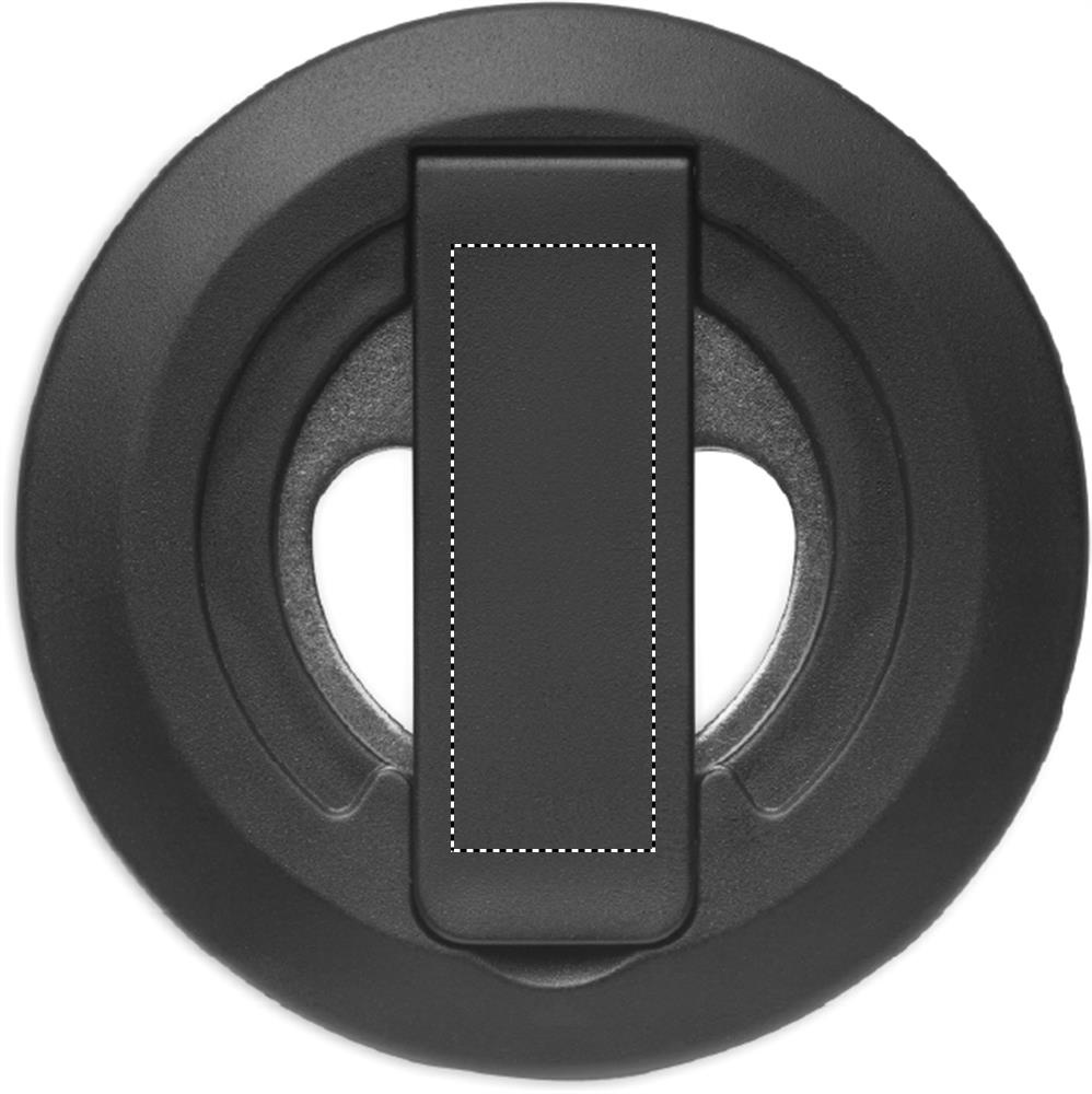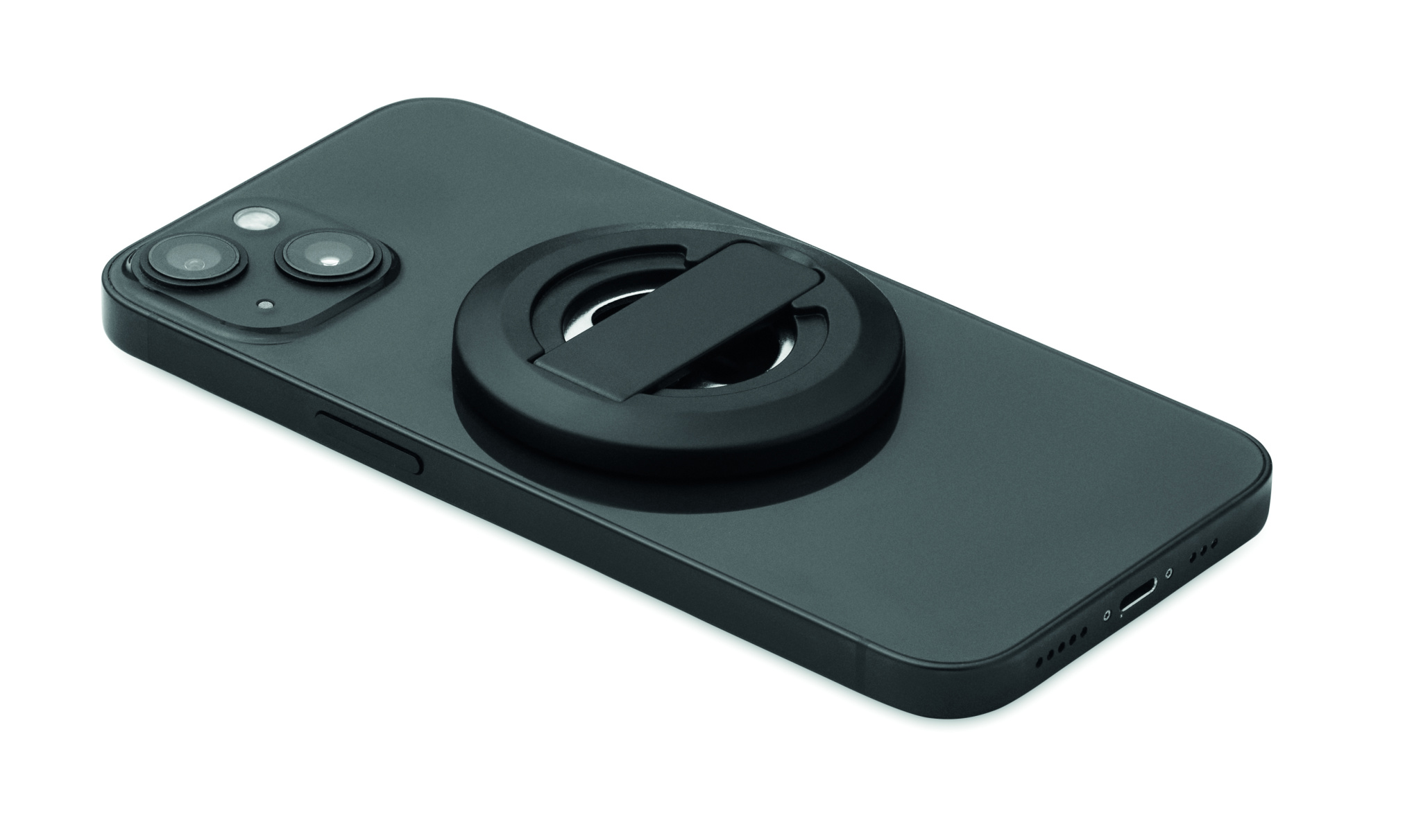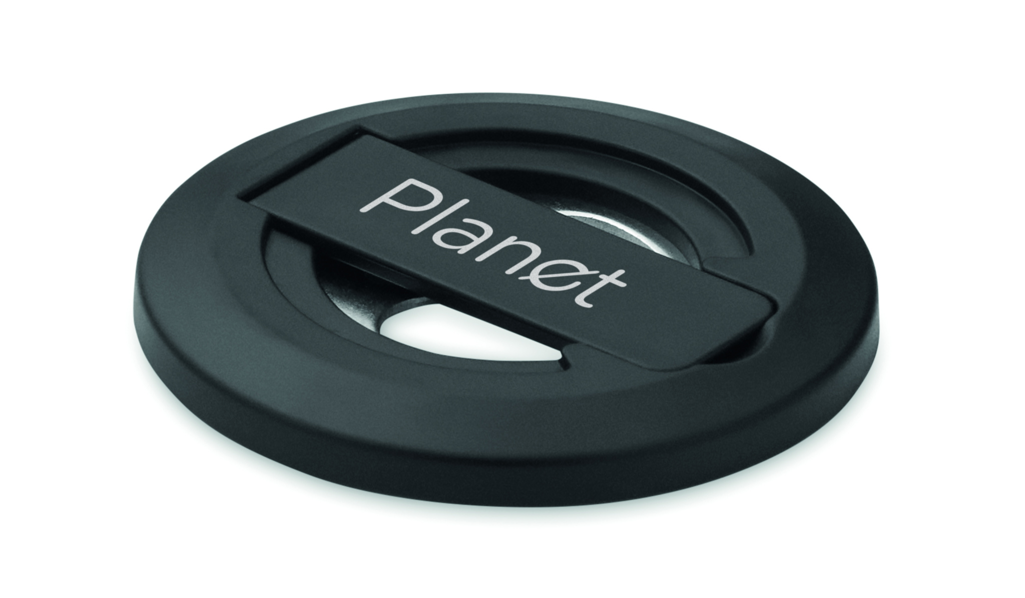 Magnetic phone holder and stand with bottle opener. Compatible with iPhone® 12 and newer. Including additional magnetic metal ring to support charging of other non-magnetic wireless chargeable phones.