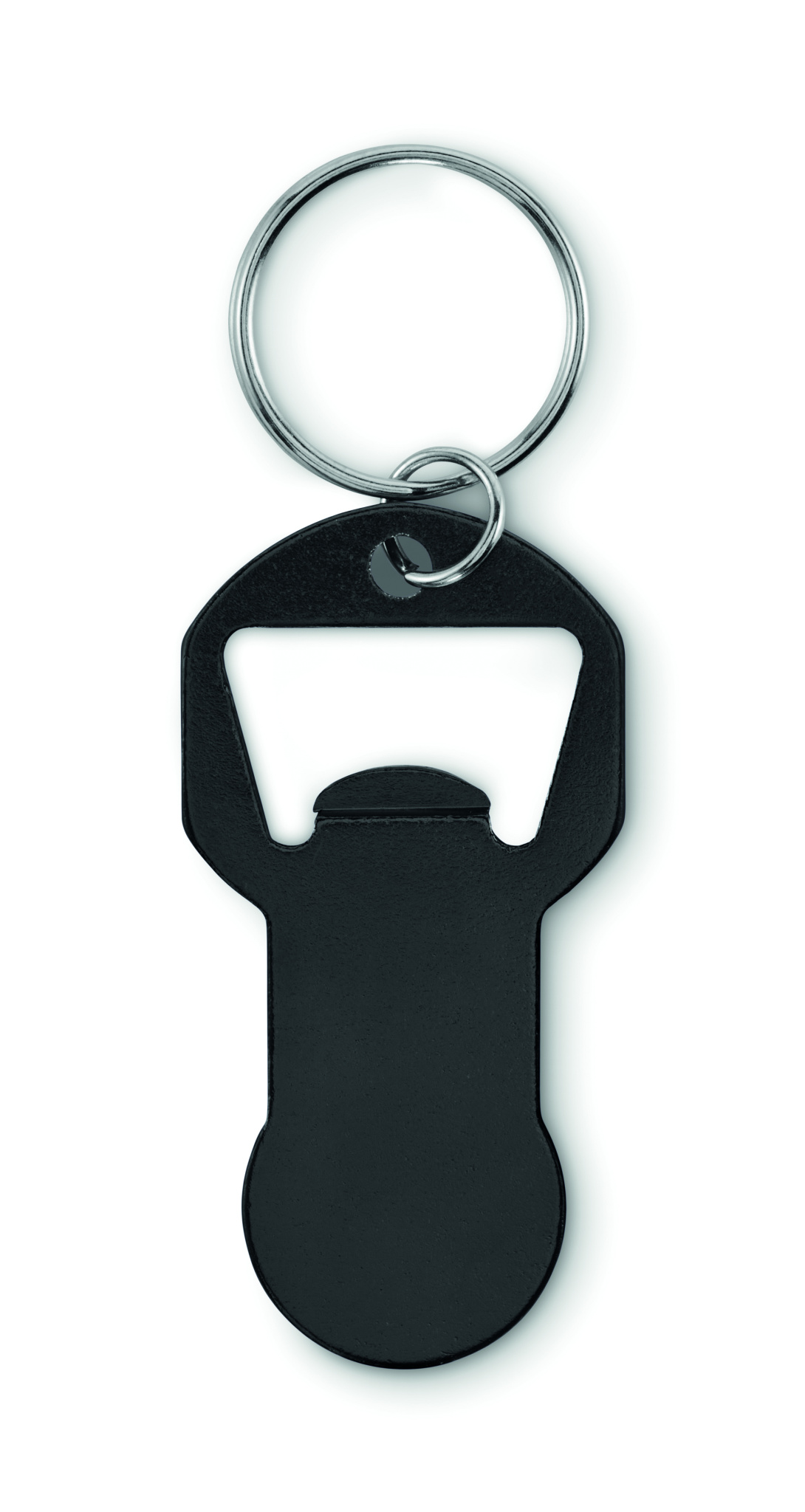 Bottle opener token keyring made of recycled aluminium with iron ring.
