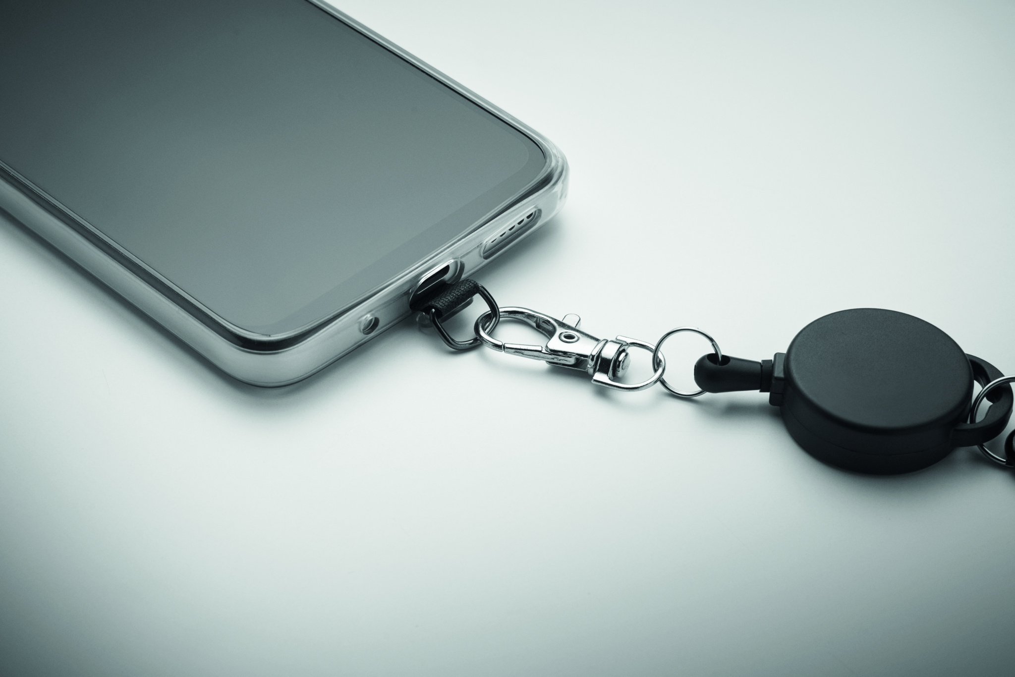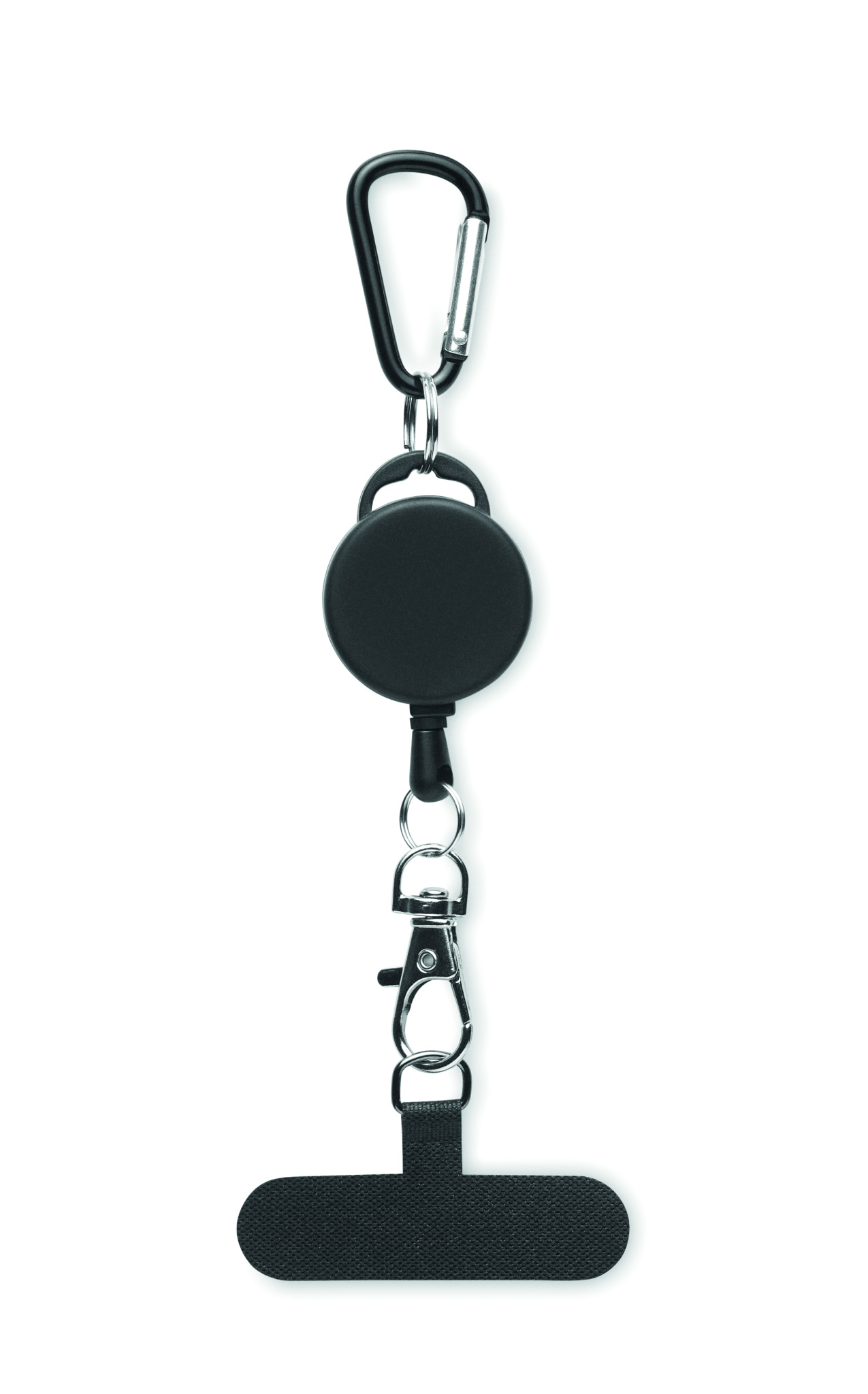 Retractable phone holder and or badge holder in ABS with aluminium carabiner. The carabiner is not for climbing (non-professional use).