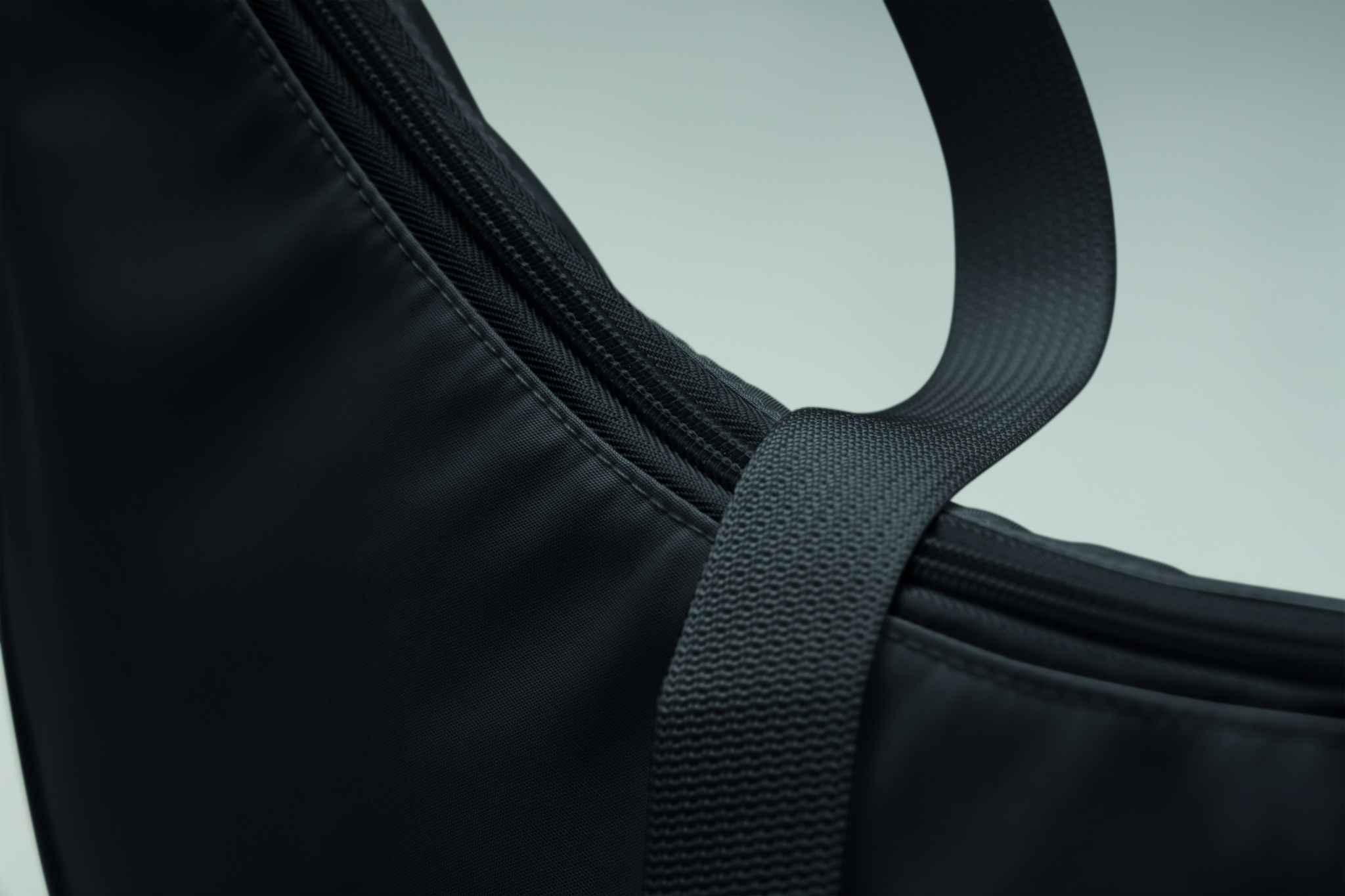 Half moon shaped cross body bag in 400D Oxford and 210D RPET lining. One main zippered pocket and 2 inside pockets.