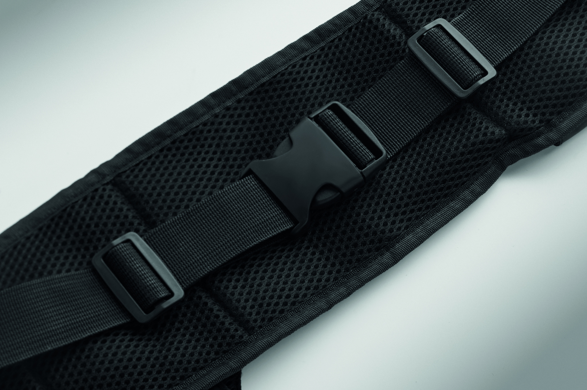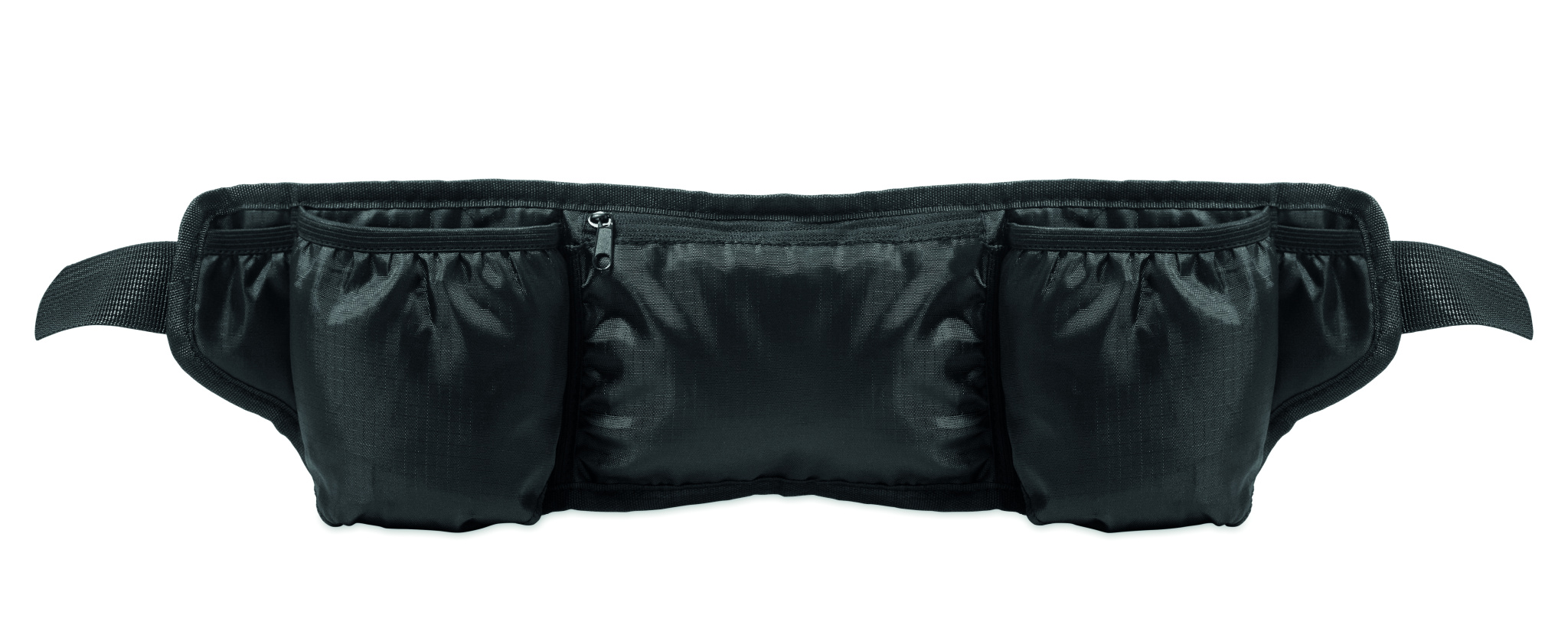 Sports running and hiking waist bag made of 420D RPET polyester with mesh back. Features two bottle compartments, central zip pocket, and adjustable strap. Lightweight and durable.