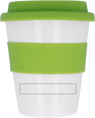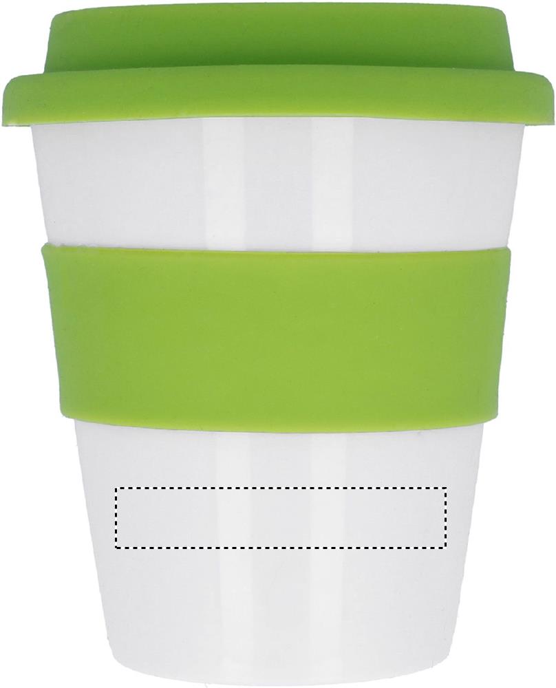 Одностенчатый стакан из блестящего белого полипропилена с силиконовой крышкой и ободком. Емкость 350мл. Поскольку это одностенчатое изделие, осторожно - может нагреваться!