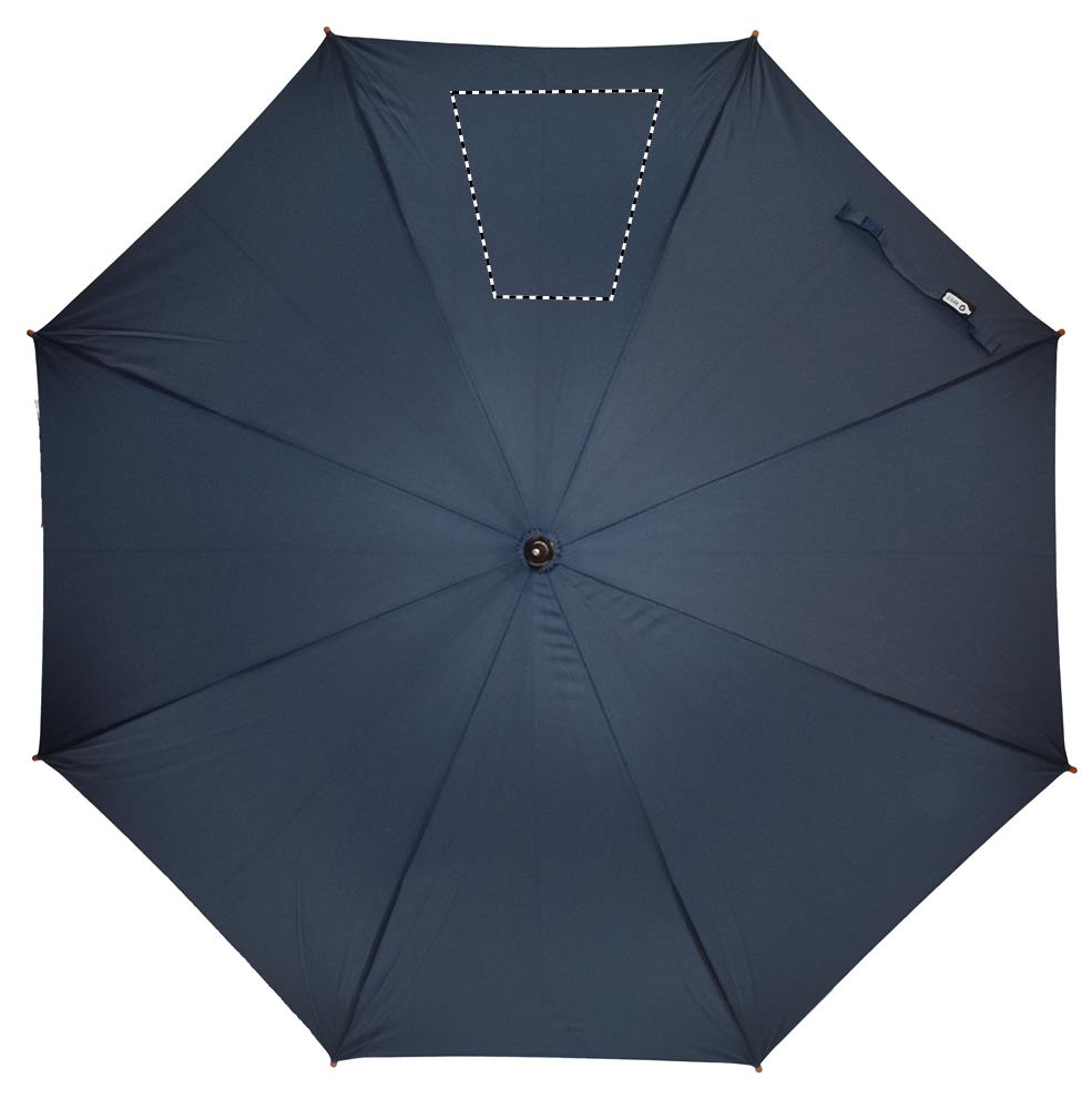 Promenadparaply, 23 tum. Med automatisk öppning. Exklusivt Pongee material i 190T återvunnen RPET. Skaft, sprötspetsar och topp i trämaterial. Svartpläterade metallribbor. Böjt naturligt trähandtag. Manuell stängning.