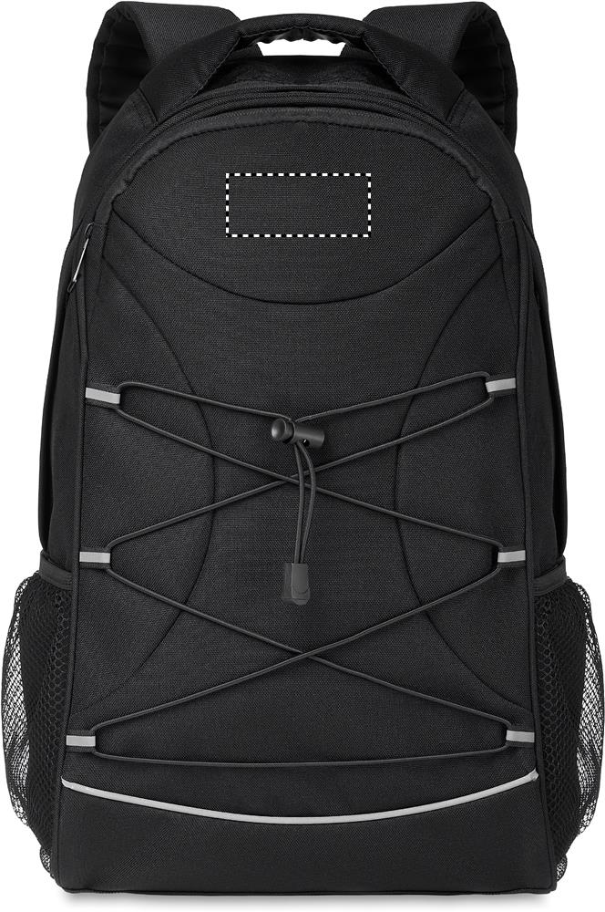 Ryggsäck i 600D RPET med mörka snören fram och reflexdetaljer på framsidan. Meshfickor på båda sidor.