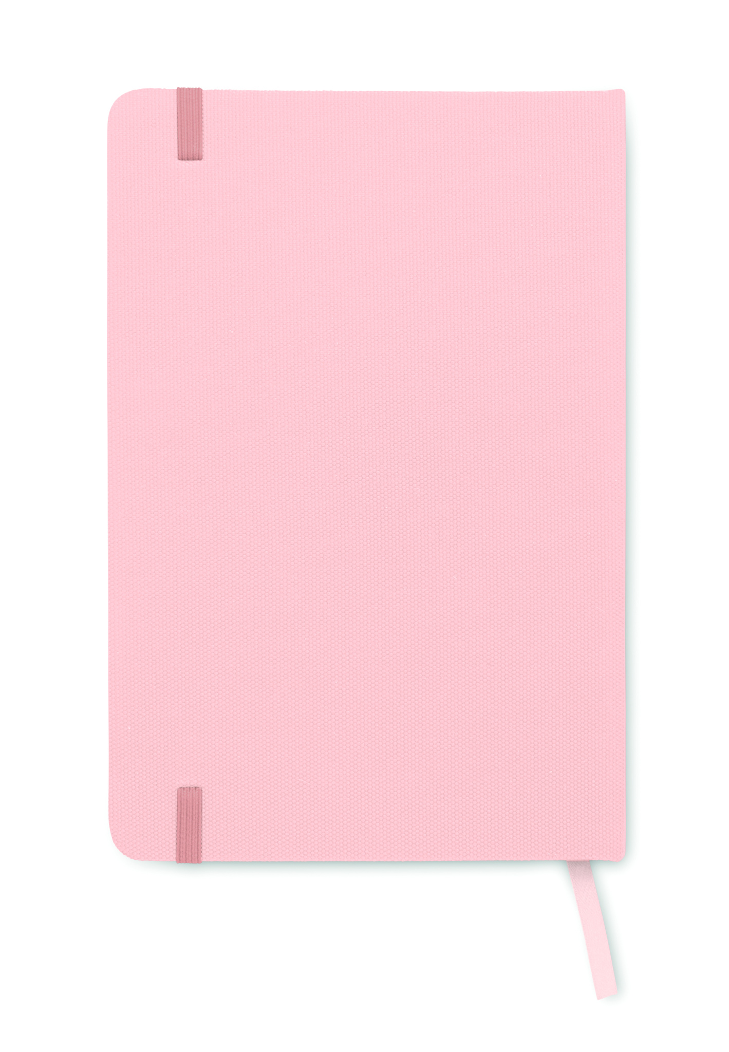 A5 anteckningsbok med 600D RPET hårt omslag och 80 linjerade sidor i återvunnet papper med ett elastiskt band och läsband.