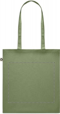 Kasse i återvunnen bomull (65 % återvunnen bomull, 35 % vanlig bomull) med långa handtag. 140 gr/m².