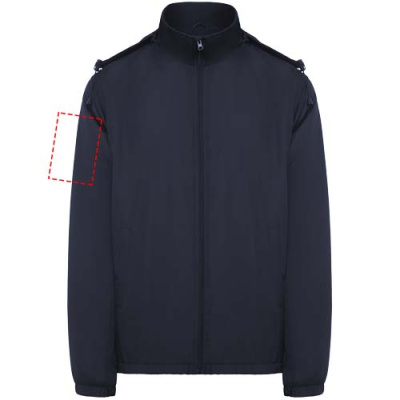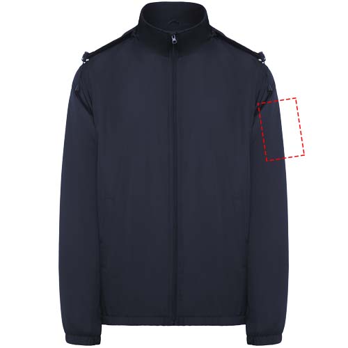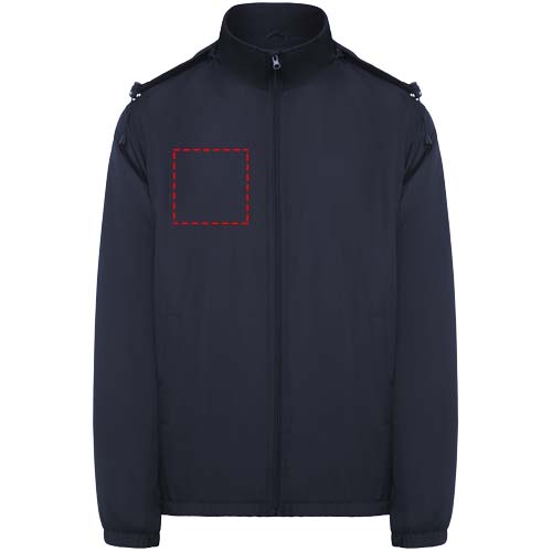 Lätt vattentät jacka. Hög krage och vikbar huva med dragsnodd. Foder i mikrofleece. Dragkedja fram och hakskydd. Elastiska muddar. Två sidfickor med dragkedja. Invändig bröstficka på vänster sida. Borttagbar etikett. Vattentät. Vindtät. Den manliga modellen är 184 cm och bär storlek L, den kvinnliga modellen är 174 cm och bär storlek S.