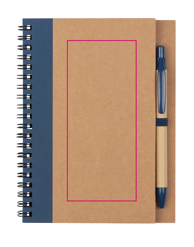 Spiralbunden anteckningsbok med 120 tomma sidor gjorda av återvunnet papper (omslag 250 gsm, sidor 60 gsm) och en pennögla. Den matchande kulspetspennan gjord av återvunnet papper, med en icke-utbytbar blåskrivande refill och ABS-plastdetaljer ingår.