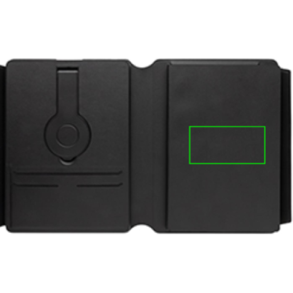 Ladda din mobil och klocka (endast Apple-klockor) trådlöst i full hastighet med denna bärbara A5 anteckningsbok i PU. Lyxig och hopvikbar 2-i-1 trådlös laddare tillverkad av RCS-certifierad återvunnen PU. Totalt återvunnet innehåll: 8% baserat på total produktvikt. RCS-certifiering garanterar en helt certifierad leveranskedja för de återvunna materialen. Fäst din telefon (iPhone 12 eller högre) på den trådlösa laddaren så kommer telefonen att anpassa sig perfekt till magneterna på insidan. Den trådlösa laddaren på 10W är kompatibel med alla QI-enheter (Iphone 8 och uppåt samt Android-enheter) Med integrerat 5.000 mAh grade-A-batteri inuti. Anteckningsboken innehåller 64 blad/128 sidor med 80 gsm linjerat FSC®-papper. Levereras i en FSC® mix kraftförpackning. Produkten och tillbehören är 100% fria från PVC. Input 9V/2A. Output: 9V/1,67A. Klocka: 5V/0,5A (2,5W).